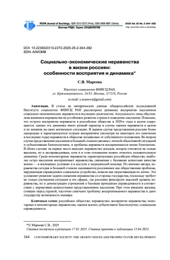 В статье на эмпирических данных общероссийских исследований Института социологии ФНИСЦ РАН рассмотрена динамика восприятия населением социально-экономических неравенств в последнее десятилетие. Актуальность темы обусловлена влиянием неравенства на устойчивое развитие страны и поведение населения. Показано, что острота восприятия неравенств в российском обществе в 2020-е годы в целом сокращается, однако эта динамика имеет разный характер в случае оценки неравенств в целом и их влияния на свою жизненную ситуацию. В первом случае представления россиян более однородны и характеризуются острым восприятием (несмотря на некоторое его смягчение в последние годы) неравенств в обществе независимо от собственного положения. Во втором случае представления населения в большей степени связаны с личной объективной ситуацией и субъективным благополучием, и проблема неравенств воспринимается менее болезненно. В обоих случаях на первое место выходит неравенство доходов, которое считается не только высоким, но и несправедливым, хотя и в этом отношении можно отметить положительную динамику. Среди немонетарных неравенств, характеризующих российское общество, наиболее остро население воспринимает неравенства, связанные с базовыми аспектами качества жизни - в жилищных условиях и в доступе к медицинской помощи. По мнению автора, неравенства сегодня в большей степени оцениваются россиянами как общественная проблема, нарушающая справедливое социальное устройство, нежели как затрагивающая их лично. Это усложняет решение задачи снижения неравенства со стороны государства, поскольку требует не только улучшения ситуации в тех сферах, где россияне фиксируют высокий уровень неравенства, но и демонстрации стремления к базовым принципам справедливости в соответствии с нормативно-ценностными представлениями населения. При этом внешние вызовы, стоящие перед страной, частично смягчают проблему воспринимаемого неравенства и дают государству возможность маневра.