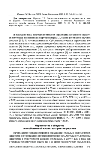 В последние годы вопросам восприятия неравенства населением уделяется все больше внимания как в зарубежном [11; 12], так и в российском научном дискурсе [1–3; 8], что неудивительно. Субъективные оценки неравенства все чаще рассматриваются как дополняющие объективные оценки общественного развития [9]; более того, первые определяют предпочтения в отношении политики перераспределения [10], выступают фактором выбора населением тех или иных поведенческих стратегий на микроуровне [6], т. е. имеют реальные последствия.