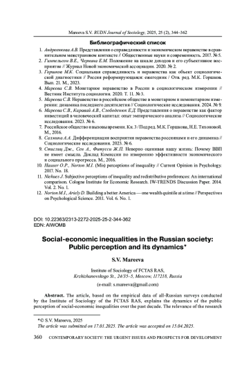 1. Андреенкова А.В. Представления о справедливости и экономическом неравенстве в сравнительном межстрановом контексте // Общественные науки и современность. 2017. № 5.