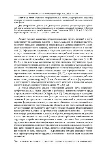 Анализ доходов социально- профессиональных групп, начатый в научной литературе советского периода [1; 22; 23], выводит на крупную научную проблему динамики социальной стратификации дореволюционного, советского и постсоветского обществ, наличии в ней преемственности и изменений (1). Официально социальная структура советского общества состояла из двух классов (занятый в промышленности «рабочий класс» со статусом «гегемона» и занятое в аграрном секторе «крестьянство») и интеллигенции как «социальной прослойки», выполняющей сервисные функции [3; 4; 11; 14; 21], и эти ключевые социальные группы считались получателями преимущественно трудовых доходов и в обществе с господством частнокапиталистических отношений.