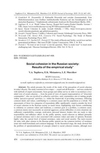 В статье представлены результаты изучения восприятия социальной сплоченности в России. Исследование состояло из двух этапов - экспертного и всероссийского - и проводилось методами экспертного опроса, фокус-групп и онлайн анкетирования, чтобы реконструировать двусторонний взгляд на социальную сплоченность - с точки зрения экспертов (представителей «сплоченных сообществ», активно вовлеченных в их деятельность; цель таких сообществ - объединение людей в рамках единой деятельности по типу «человек-человек», т. е. в рамках оказания помощи, следования общим идеалам и ценностям, вклада в общее дело) и населения в целом. Оценки двух категорий опрошенных существенным образом различаются: эксперты значительно ниже оценивают уровень социальной сплоченности российского общества, выделяя такие факторы, способствующие сплоченности, как общие ценности и традиции, общая цель или проблема, общее дело, общий враг (необязательно внешний агрессор, достаточно определенных трудностей или кризисных ситуаций); ответственность, смелость, мотивация, личный интерес; лидеры, готовые взять на себя ответственность, повлиять на других. Россияне определяют социальную сплоченность как прежде всего взаимную помощь; также ассоциируют ее с общими ценностями и единством мнений; высоко оценивают современный уровень взаимовыручки и единства в российском обществе, а также ощущение безопасности. Основными причинами единения с другими гражданами в общественном мнении выступают общность территории проживания (государство и малая родина) и языка. На теоретическом этапе исследование показало, что в изучении социальной сплоченности сохраняется проблема операционализации понятий, хотя большинство ученых подразумеваются под сплоченностью общества, в первую очередь, его солидаризацию благодаря общим ценностям. В исследовании был проведен сравнительный анализ таких ключевых понятий, как «социальная сплоченность» и «солидарность», в том числе в контексте классических и современных их концептуализаций.
