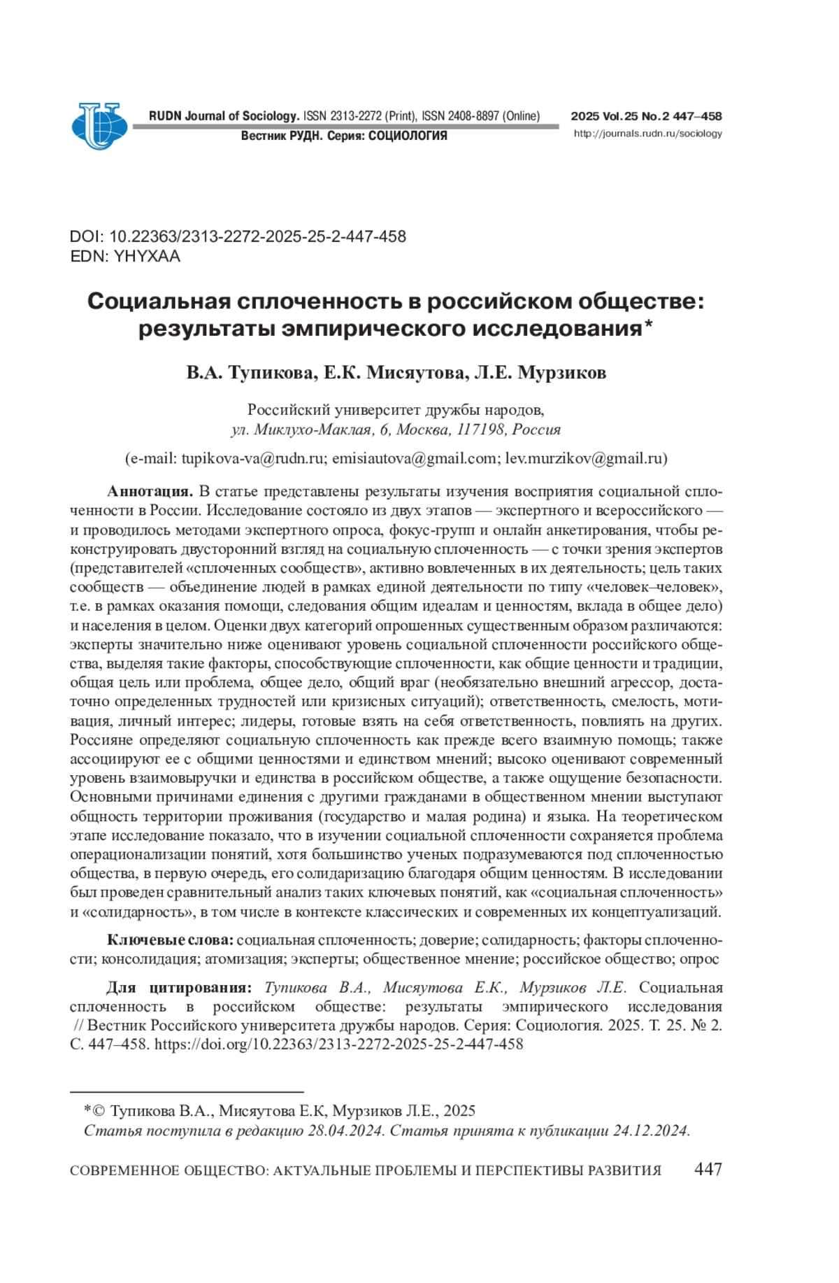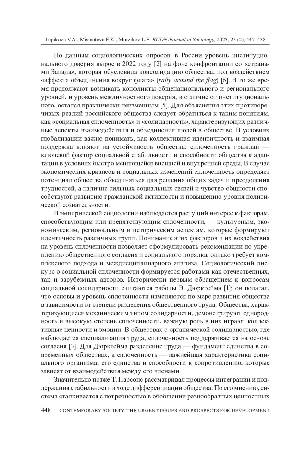 14. Сорокин П.С., Попова Т.А. Классические и современные подходы к исследованию солидарности: проблемы и перспективы в условиях деструктурации // Вестник РУДН. Серия: Социология. 2021. Т. 21. № 3.
