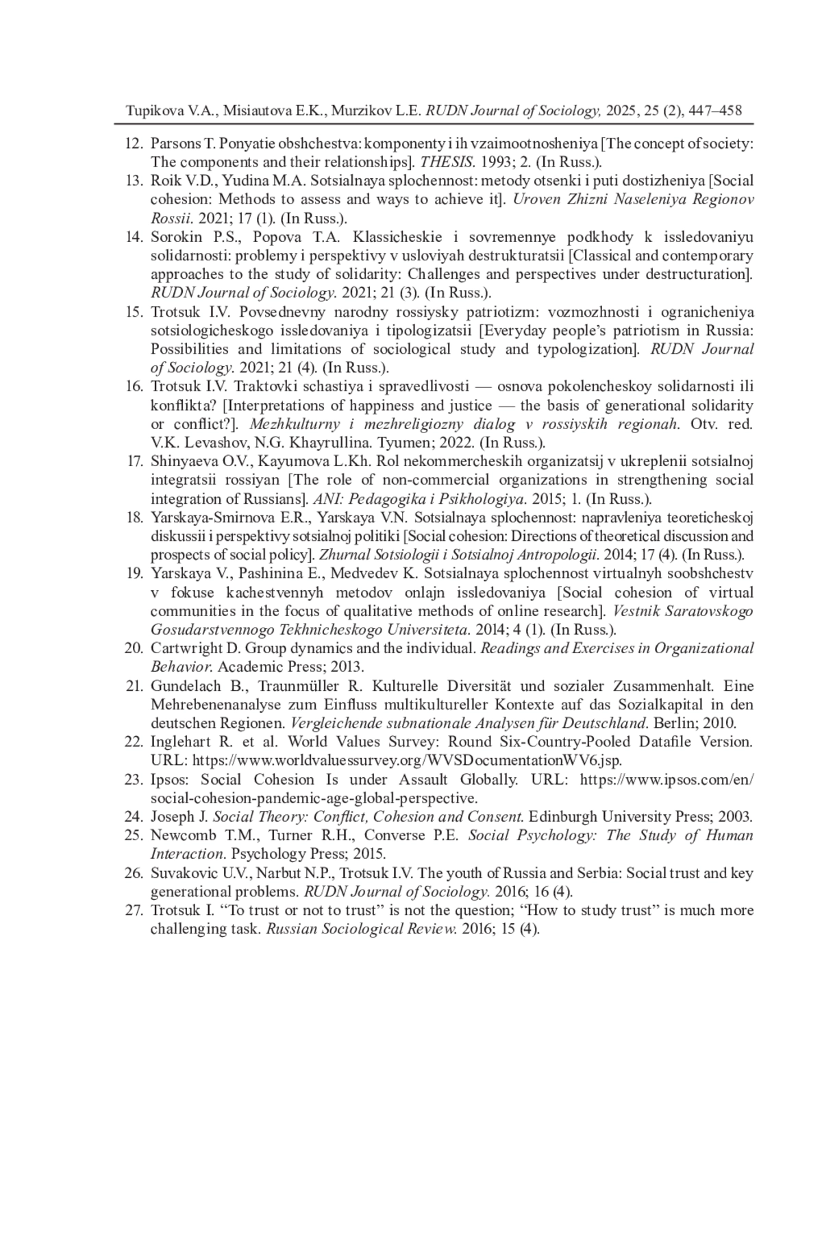 26. Suvakovic U.V., Narbut N.P., Trotsuk I.V. The youth of Russia and Serbia: social trust and key generational problems // Вестник РУДН. Серия: Социология. 2016. Т. 16. № 4.