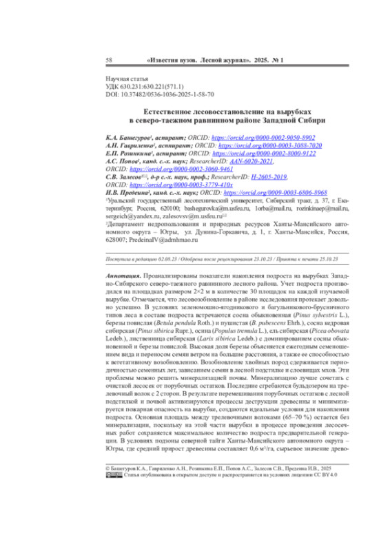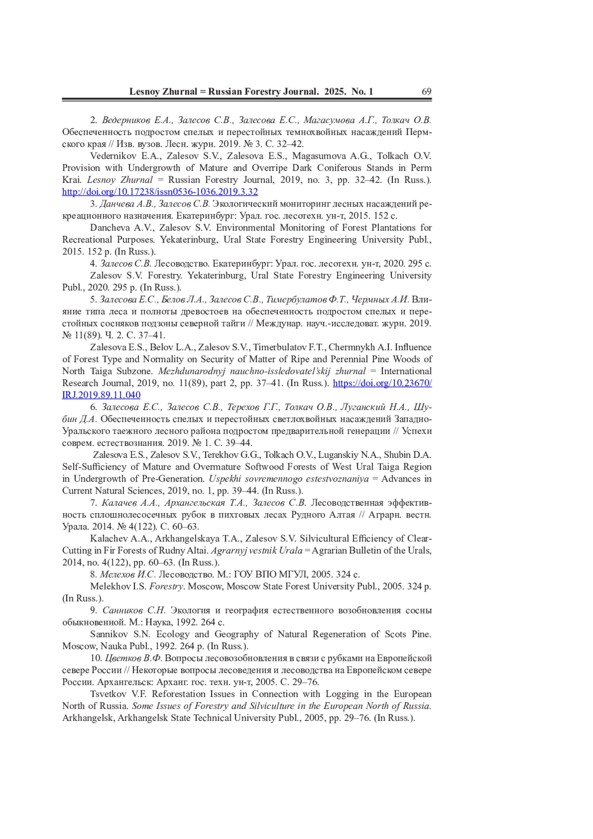 6. Залесова Е.С., Залесов С.В., Терехов Г.Г., Толкач О.В., Луганский Н.А., Шубин Д.А. Обеспеченность спелых и перестойных светлохвойных насаждений Западно-Уральского таежного лесного района подростом предварительной генерации // Успехи соврем. естествознания. 2019. No 1. С. 39-44. EDN: YYIIHZ