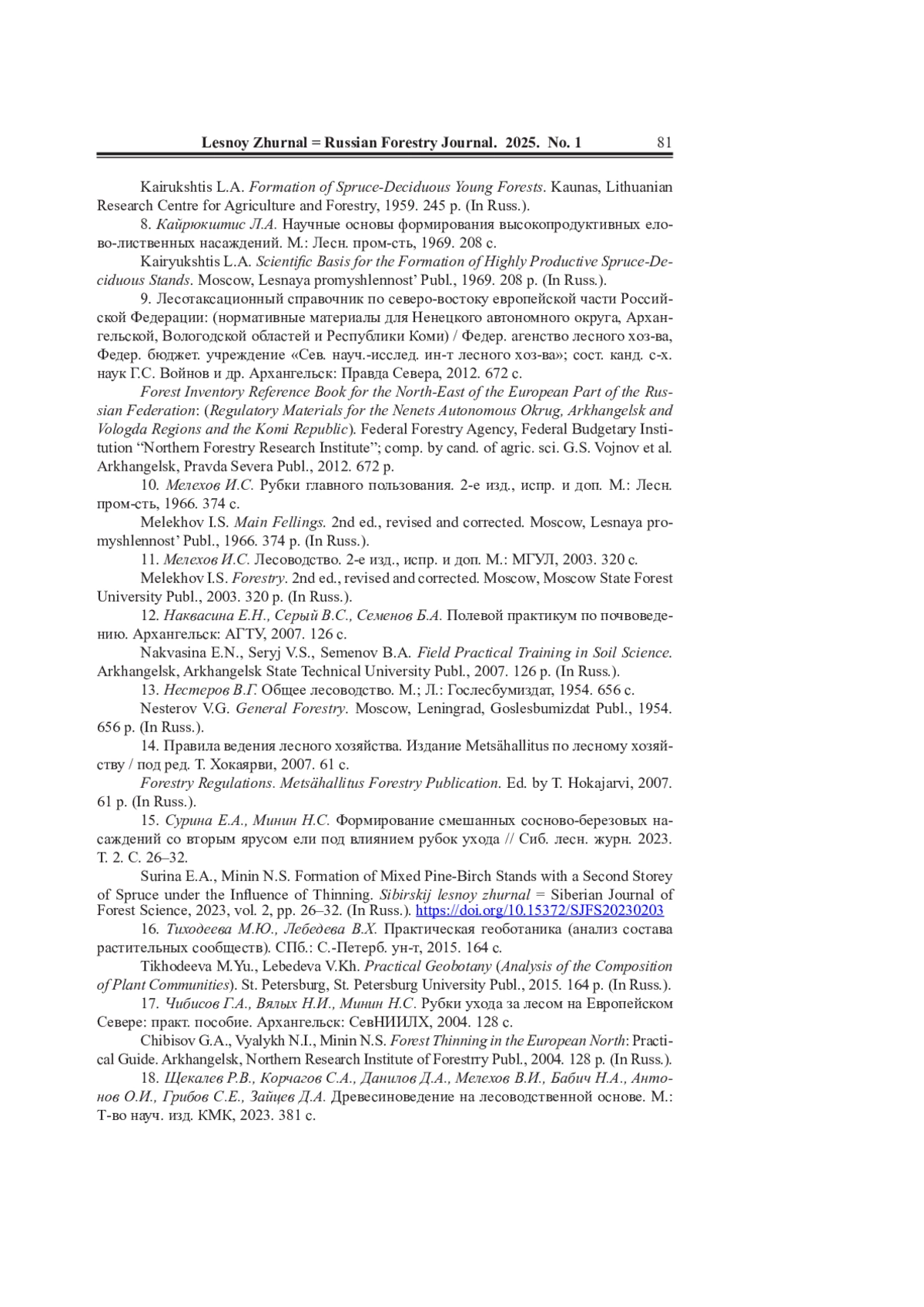 15. Сурина Е.А., Минин Н.С. Формирование смешанных сосново-березовых насаждений со вторым ярусом ели под влиянием рубок ухода // Сиб. лесн. журн. 2023. Т. 2. С. 26-32. EDN: ZCNVZG