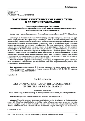 В статье рассматривается влияние процесса цифровизации на развитие рынка труда России. Определено то, что цифровизация рынка труда влияет на способы поиска работы и взаимодействия между работодателями и соискателями, делая процессы более прозрачными и динамичными благодаря использованию онлайн-платформ и социальных сетей. С развитием цифровых технологий рынок труда переживает значительные трансформации. Спрос на специалистов в области информационных технологий растёт, как и важность навыков в сфере цифровой грамотности для широкого круга профессий. Появляются новые специальности, связанные с обработкой больших данных, искусственным интеллектом и машинным обучением. Профессиональные навыки требуют постоянного обновления в соответствии с быстро меняющимися технологиями. В заключение отмечено, что перед учёными и экспертами встают новые исследовательские вопросы, связанные с институционализацией и институциональным регулированием новых форм занятости и организации труда в условиях развития противоречивых и неоднозначных экономических моделей.
