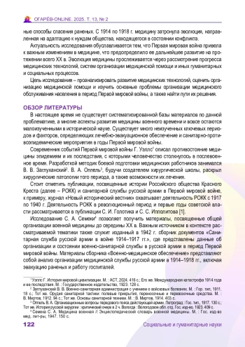 2. Будко А. А., Селиванов Е. Ф., Чигарева Н. Г. “В известные моменты на войне не медицина, не наука, не операция играют самую важную роль, а организация работы…”: Военная медицина России в годы Первой мировой войны // Военно-исторический журнал. 2004. № 8. С. 57-62. URL: https://warlib.site/budko-selivanov-chigareva/ (дата обращения: 10.02.2025).