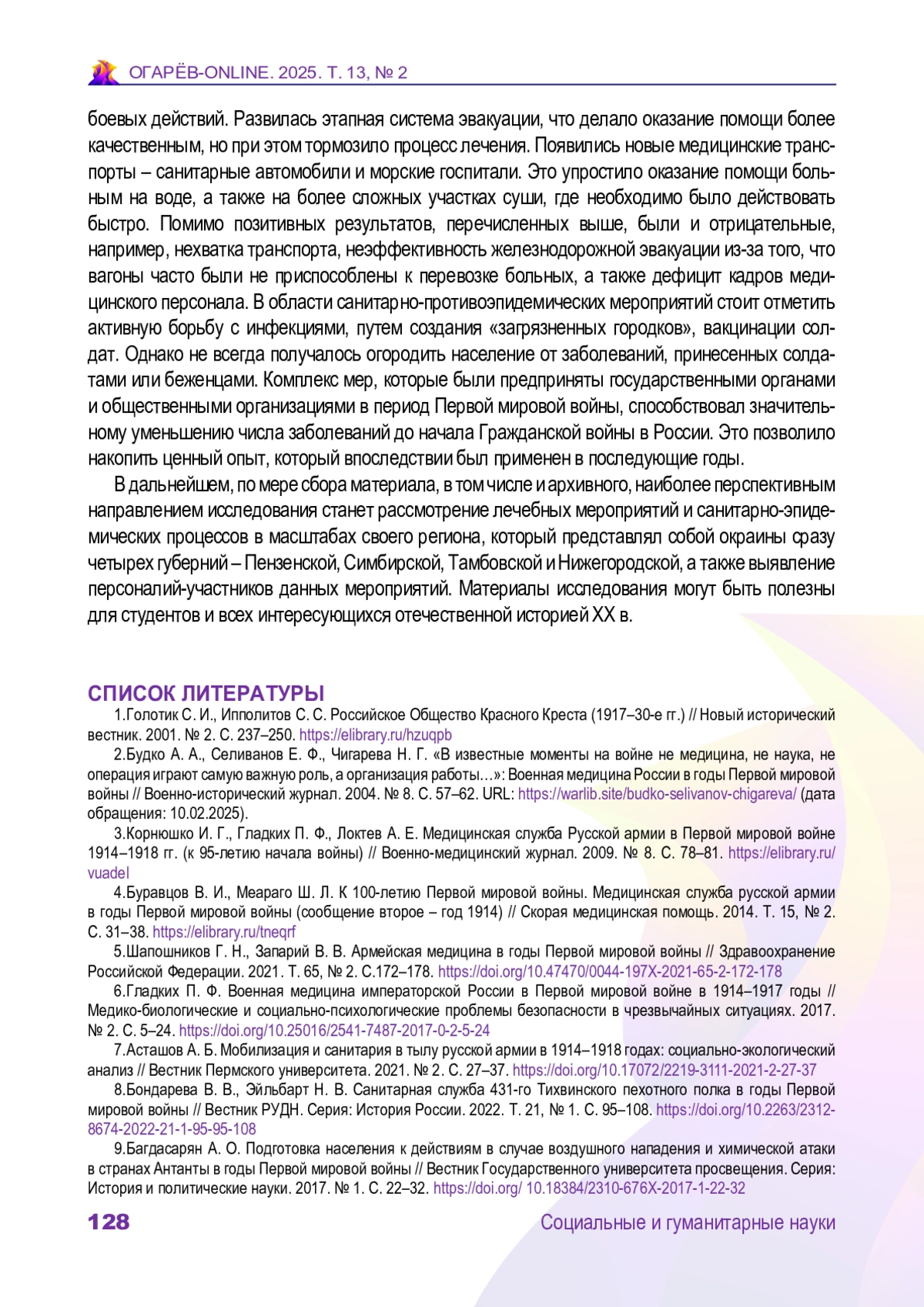 6. Гладких П. Ф. Военная медицина императорской России в Первой мировой войне в 1914-1917 годы // Медико-биологические и социально-психологические проблемы безопасности в чрезвычайных ситуациях. 2017. № 2. С. 5-24. DOI: 10.25016/2541-7487-2017-0-2-5-24