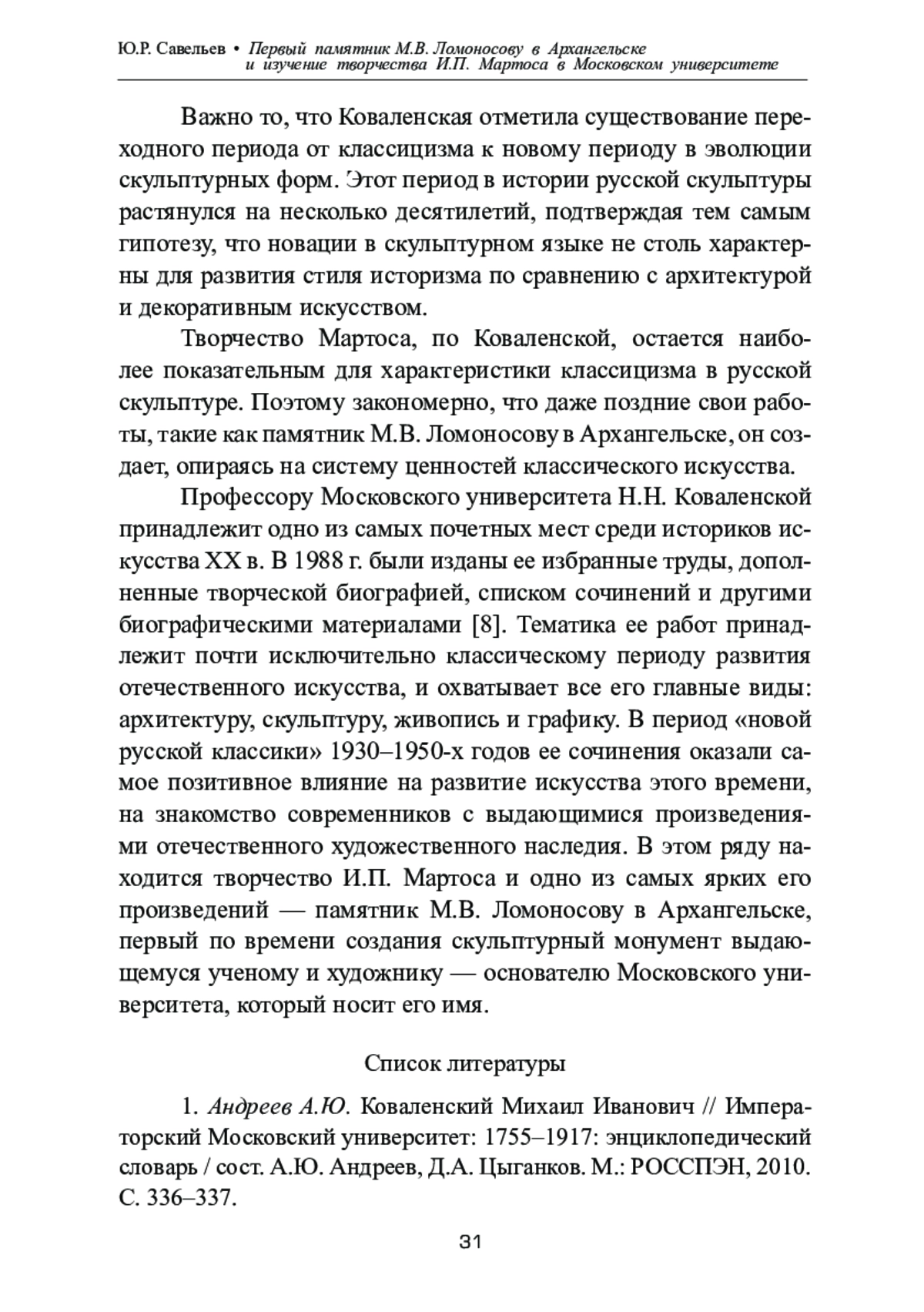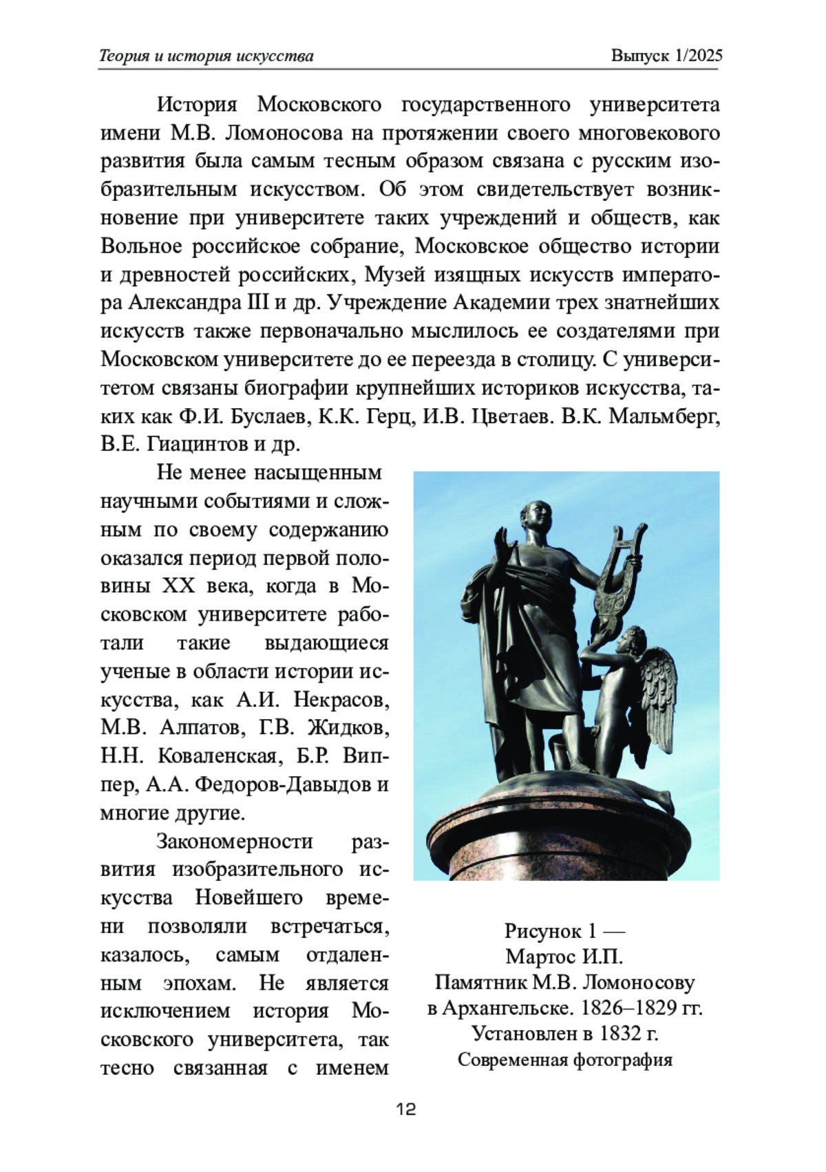 В развитии русского искусства период классицизма (середина XVIII - середина XIX в.) предшествовал эпохе историзма XIX - начала ХХ в., а период неоклассицизма (первая половина ХХ в.) завершал ее историю. Главным источником развития стиля историзма была отечественная история, и в периоды его зарождения и завершения образы М. В. Ломоносова были запечатлены в бронзе выдающимися скульпторами И. П. Мартосом в 1826-1829 гг. (в Архангельске) и Н. В. Томским в 1953 г. (перед зданием Московского университета на Воробьевых горах). В период неоклассицизма или «нового русского классицизма» 1930-1950-х годов Московский университет становится одним из главных центров изучения искусства первого русского классицизма. Профессор Н. Н. Коваленская (1892-1969) - крупнейший специалист по истории этого стиля - создает наиболее полную до сегодняшнего дня монографию о жизненном пути И. П. Мартоса - автора первого скульптурного памятника М. В. Ломоносову в России. Творчество этого ваятеля она считала вершиной развития русской монументальной скульптуры. Впервые вводятся в научный обиход личные материалы профессора Н. Н. Коваленской из архива МГУ. Развитие искусства классицизма и неоклассицизма, изучение истории обоих этих периодов была теснейшим образом связана с историей Московского государственного университета имени М. В. Ломоносова (МГУ), а также с изучением творчества скульптора И. П. Мартоса - автора первого скульптурного монумента основателю университета.