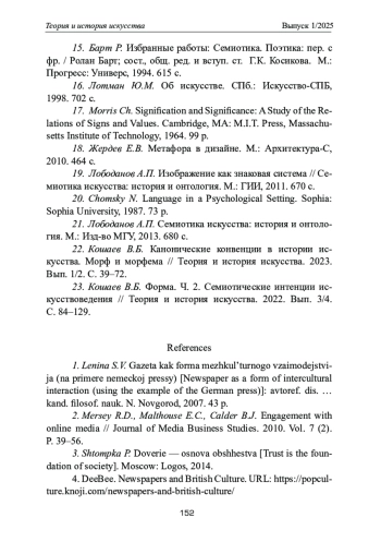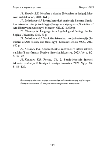 23. Кошаев В.Б. Форма. Ч. 2. Семиотические интенции искусствоведения //Теория и история искусства. 2022. Вып. 3/4. С. 84-129.