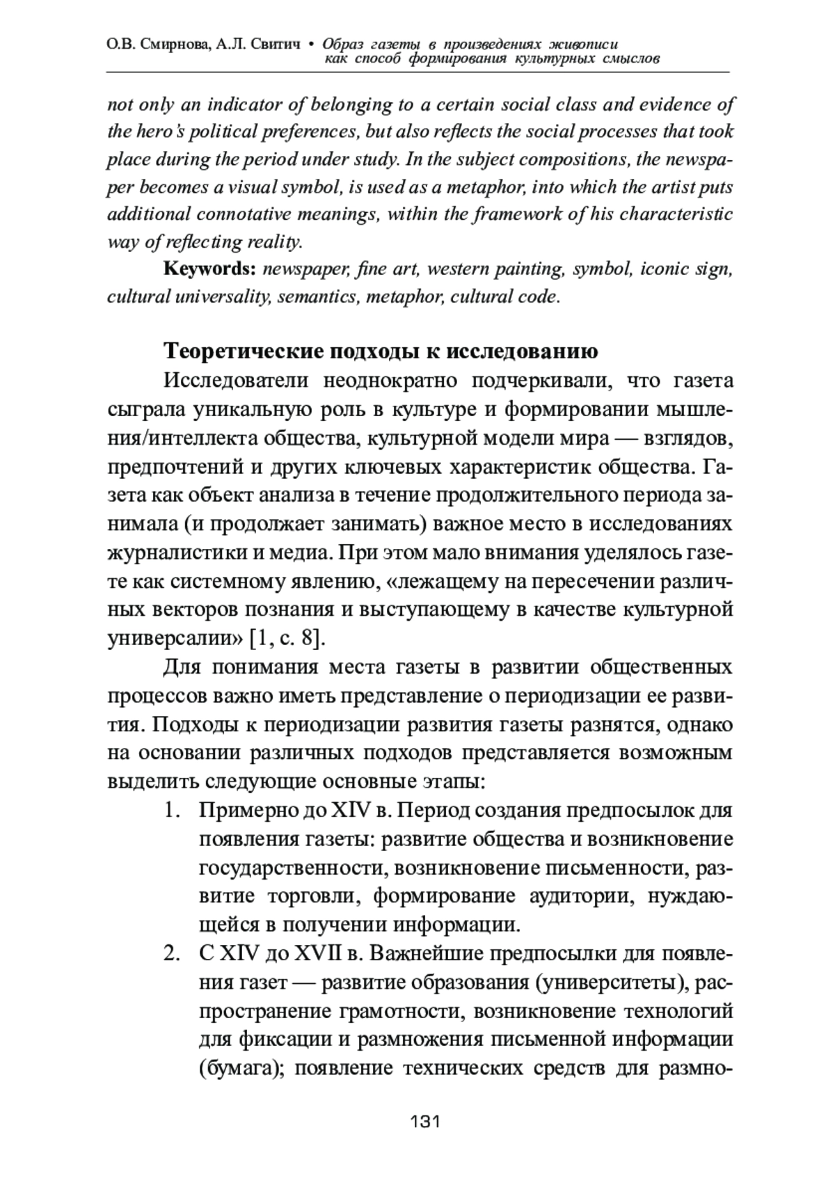 Статья посвящена анализу образа газеты в произведениях изобразительного искусства. В работе дается обзор репрезентации газеты в зарубежной изобразительной традиции, в которой она занимала важное место как социокультурный и искусствоведческий феномен. Обобщена периодизация этапов развития газеты и выявлена связь исторических реалий с ее отображением в западной живописи XVII‒XXI вв. Исследование показало, что именно газета как первое средство массовой информации создала основания для формирования объединяющих общественных смыслов. В произведениях изобразительного искусства газета предстает как культурно-ментальная форма, отражающая и формирующая национально-бессознательное. Образ газеты в западном изобразительном искусстве отражает ее двойственный характер — она представлена и как источник информации, участвующий в процессе коммуникации со зрителем, и как визуальный символ, понятный широкой аудитории. Однако в обоих случаях использование газеты как объекта всегда апеллирует к общественно-политическим процессам, а также отражает ключевые культурные коды. В портретной и жанровой зарубежной живописи газета не только становится индикатором принадлежности к определенному социальному классу и свидетельством политических пристрастий героя, но и отражает общественные процессы, происходившие в исследуемый период. В предметных композициях газета становится визуальным символом, используется как метафора, в которую художником вкладываются дополнительные коннотативные значения, в рамках свойственного ему способа отражения действительности.