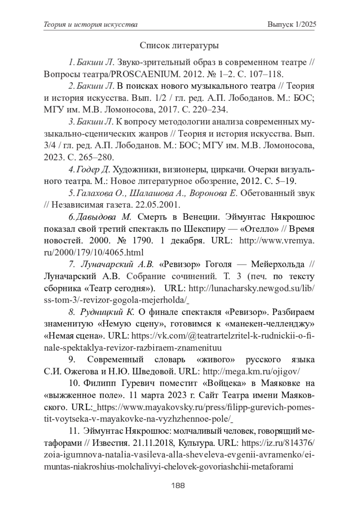 1. Бакши Л. Звуко-зрительный образ в современном театре // Вопросы театра/PROSCAENIUM. 2012. № 1-2. С. 107-118.