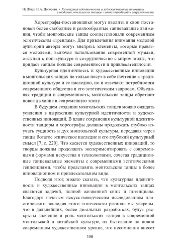 Монгольские танцы, являясь важным нематериальным культурным наследием Китая, демонстрируют уникальную культурную идентичность и гуманитарные художественные ценности монгольского народа. В данной статье рассматривается, как в процессе создания монгольских танцев происходит искусное слияние традиционных и современных элементов, а также влияние этого слияния на культурную идентичность и художественные инновации. Культурная идентичность и художественные инновации в создании монгольских танцев взаимозависимы и взаимно поддерживают друг друга. Благодаря искусному сочетанию традиционных и современных элементов, монгольские танцы сохраняют свою уникальность и одновременно демонстрируют очарование и дух времени. Такой подход к творчеству предоставляет реальный путь для сохранения и развития монгольской культуры, а также служит примером для создания танцев других народов в контексте межкультурного обмена. Монгольское танцевальное искусство, являясь неотъемлемой частью культурного строительства Китая, должно быть тесно связано с ожиданиями партии и государства в отношении культурной деятельности. В процессе создания монгольских танцев следует в полной мере отражать культурную идентичность в формах, содержании, темах и духе. В статье отмечается необходимость учитывать концепции развития современного общества и использовать передовые технологии искусственного интеллекта для всесторонних инноваций, что будет способствовать процветанию монгольских танцев и эффективному сохранению и защите традиционной танцевальной культуры.