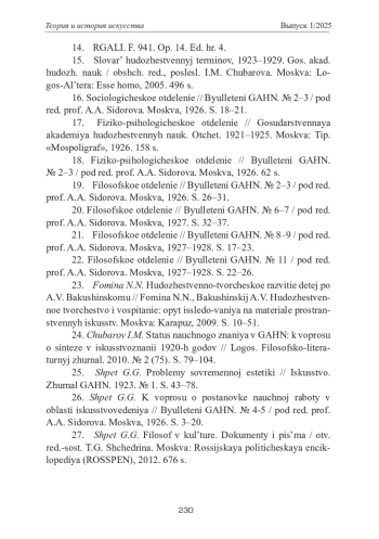 11. Подземская Н.П. От “установления художественной терминологии” к новой науке об искусстве в ГАХН на материале дискуссий о материале и фактуре //Логос. Философско-литературный журнал. 2010. № 2 (75). С. 68-78.