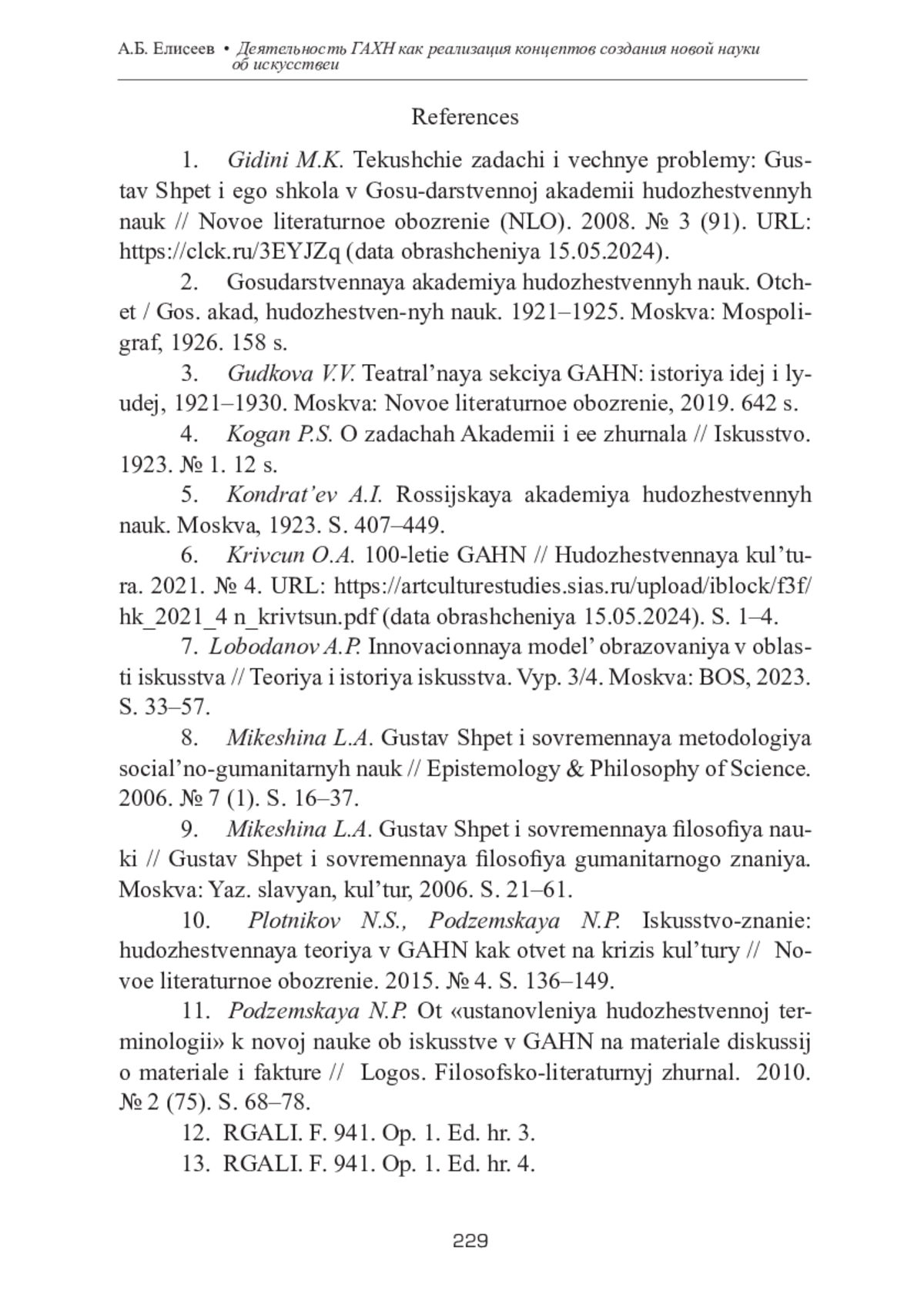 6. Кривцун О.А. 100-летие ГАХН // Художественная культура. 2021. № 4. URL: https://artculturestudies.sias.ru/upload/iblock/f3f/hk_2021_4n_krivtsun.pdf (дата обращения 15.05.2024). С. 1-4.