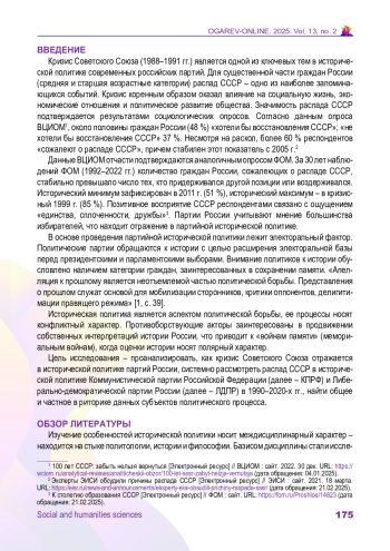 Кризис Советского Союза (1988–1991 гг.) является одной из ключевых тем в исторической политике современных российских партий. Для существенной части граждан России (средняя и старшая возрастные категории) распад СССР – одно из наиболее запоминающихся событий. Кризис коренным образом оказал влияние на социальную жизнь, экономические отношения и политическое развитие общества. Значимость распада СССР подтверждается результатами социологических опросов. Согласно данным опроса ВЦИОМ1, около половины граждан России (48 %) «хотели бы восстановления СССР»; «не хотели бы восстановления СССР» 37 %. Несмотря на раскол, более 60 % респондентов «сожалеют о распаде СССР», причем стабилен этот показатель с 2005 г.2.