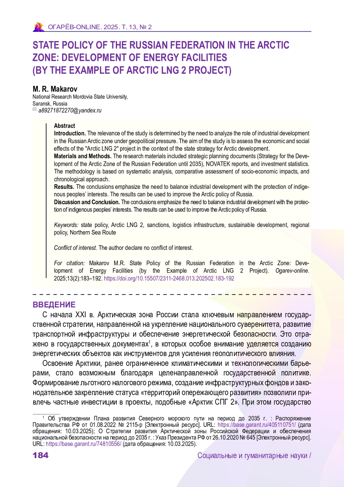 Введение. Проблемы промышленного развития Арктической зоны Российской Федерации в условиях геополитического давления приобретают особую значимость. Цель исследования – описание экономических и социальных эффектов проекта «Арктик СПГ 2» в контексте государственной стратегии освоения Арктики.