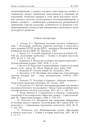 8. Клюканова Л.Г. Частное коллекционирование как предмет культурологического исследования // Труды Санкт-петербургского государственного института культуры. 2015. № 3. С. 246-254.