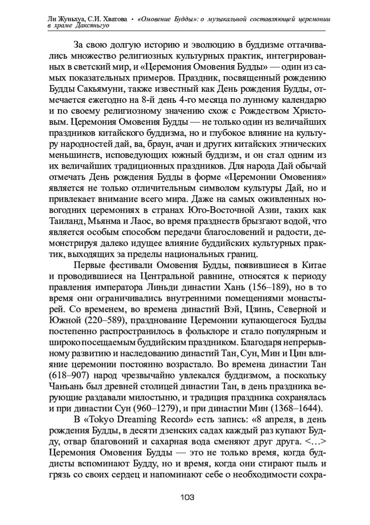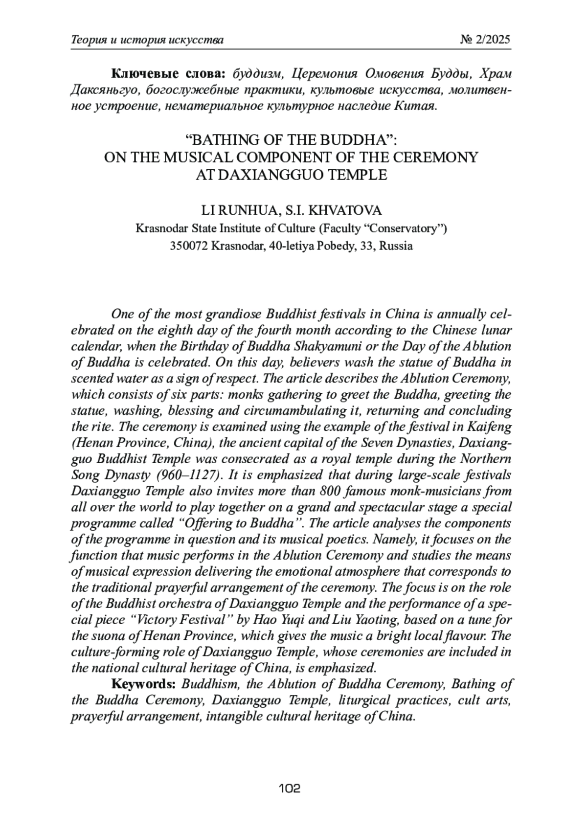 Один из самых грандиозных буддийских фестивалей в Китае ежегодно отмечается в 8-й день 4-го месяца по китайскому лунному календарю, когда празднуется День рождения Будды Шакьямуни или День Омовения Будды. В этот день верующие совершают омовение статуи Будды в ароматизированной благовониями воде в знак уважения. В статье описывается церемония Омовения, состоящая из шести частей: сбор монахов для приветствия Будды, приветствие статуи, омовение, благословение и обход вокруг нее, возвращение и завершение обряда. Церемония рассмотрена на примере праздника в Кайфэне (провинция Хэнань, Китай), древней столице семи династий, буддийский храм Даксяньгуо был освящен как королевский храм во времена правления династии Северная Сун (960‒1127). Акцентируется внимание на том, что во время масштабных праздников храм Даксяньгуо также приглашает более 800 знаменитых монахов-музыкантов со всего мира, чтобы они сыграли вместе на грандиозной и зрелищной сцене специальную программу «Приношение Будде»1 и анализируется ее составляющие и музыкальная поэтика. Анализируется функция музыки в контексте богослужебной церемонии Омовения Будды и средства музыкальной выразительности, призванные для воссоздания образно-эмоциональной атмосферы, соответствующей традиционному молитвенному устроению церемонии. Акцентируется внимание на роли буддийского оркестра храма Даксяньгуо и исполнении в рамках праздник специальной пьесы «Праздник победы» Хао Юци и Лю Яотина, в основу которой положен наигрыш для суоны провинции Хэнань, что придает музыке яркий локальный колорит. Подчеркивается культурообразующая роль прихода храма Даксяньгуо, церемонии которого причислены к национальному культурному наследию Китая