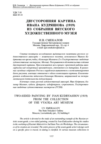 Статья посвящена исследованию выдающегося памятника русского художественного авангарда — живописного полотна, исполненного Иваном Кудряшовым во время учебы у Казимира Малевича (2-е Государственные свободные художественные мастерские, Москва). Раскрываются обстоятельства создания двусторонней картины. Прослеживается весь процесс проектной работы авангардиста над конкретным произведением, уточняется его датировка. В различных музейных собраниях России и зарубежья выявляются и систематизируются блоки рисунков, имеющих отношение к обеим композициям картины. Комментируются особенности педагогики Казимира Малевича, направленной на экспериментальную деятельность подмастерьев. Ключевые слова: русский художественный авангард, Иван Кудряшов, Казимир Малевич, кубизм, футуризм, кубофутуризм, супрематизм, Государственные свободные художественные мастерские (ГСХМ).
