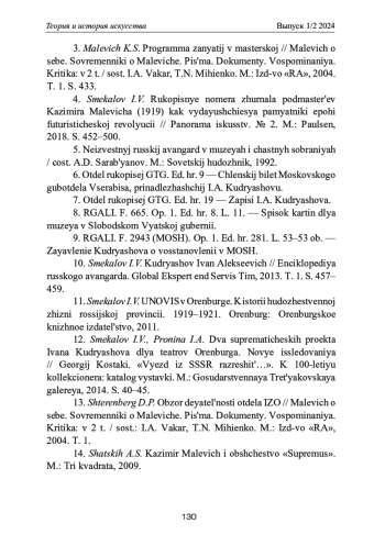 4. Смекалов И.В. Рукописные номера журнала подмастерьев Казимира Малевича (1919) как выдающиеся памятники эпохи футуристической революции // Панорама искусств. № 2. М.: Паулсен, 2018. С. 452-500.