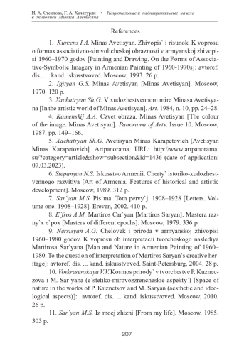 9. Нерсисян А.Г. Человек и природа в армянской живописи 1960-1980 годов. К вопросу об интерпретации творческого наследия Мартироса Сарьяна: автореф. дис.. канд. искусствовед. - СПб.: СПбГАИЖСА им. И.Е.Репина, 2004. - 28 с. EDN: ZMWSJN