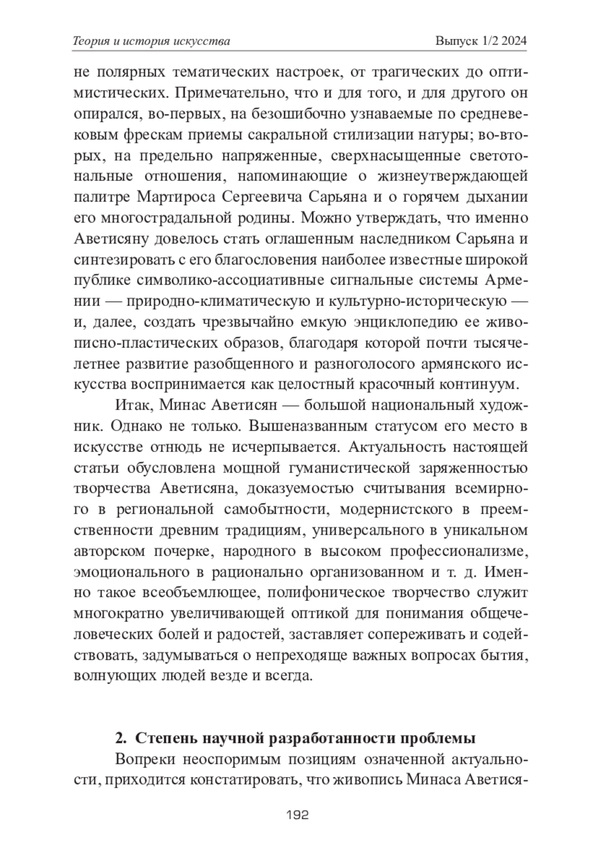Объектом исследования в рамках настоящей статьи являются произведения станковой и монументальной живописи Минаса Аветисяна. В качестве предмета исследования рассматриваются закономерности художественного конструирования сюжетов, тем, образов этой живописи в конкретных пространственных, линейно-ритмических и светотональных особенностях. Цель — определить формально-содержательную сущность авторского стиля Аветисяна в обстоятельствах становления и воздействия на современников, которое продолжается до сих пор. В становлении стиля подчеркивается влияние традиций средневековых фресок и манускриптов и персональных новаций Мартироса Сарьяна, в которых сублимировано увлечение французским фовизмом. Именно в диалоге с этими традициями и с этими новациями прослеживается эволюция художника, а также метаморфозы выражения патриотической, религиозной, философской тематики в армянской живописи XX в. Сравнение живописных образов разного времени осуществляется в методологии семантического и формально-композиционного анализа. В результате сравнения делается вывод о том, что стиль Минаса Аветисяна характеризует моделировка упрощенных, экспрессивно стилизованных форм в резких светотональных контрастах, насыщенных эпическим драматизмом; и это демонстрация, во-первых, устойчивых приоритетов национального миропонимания; во-вторых, наднационального гуманистического миропонимания. Показывается, что исключительная эстетическая чуткость и незаурядный масштаб личности позволили Аветисяну органически совместить первое и второе, стать своего рода проводником-просветителем для множества пытливых, страждущих истины зрителей, способствовать тому, что разнообразное искусство Армении узнается практически сразу же по всему свету, воспринимается как целостный иконографический и символико-ассоциативный феномен.