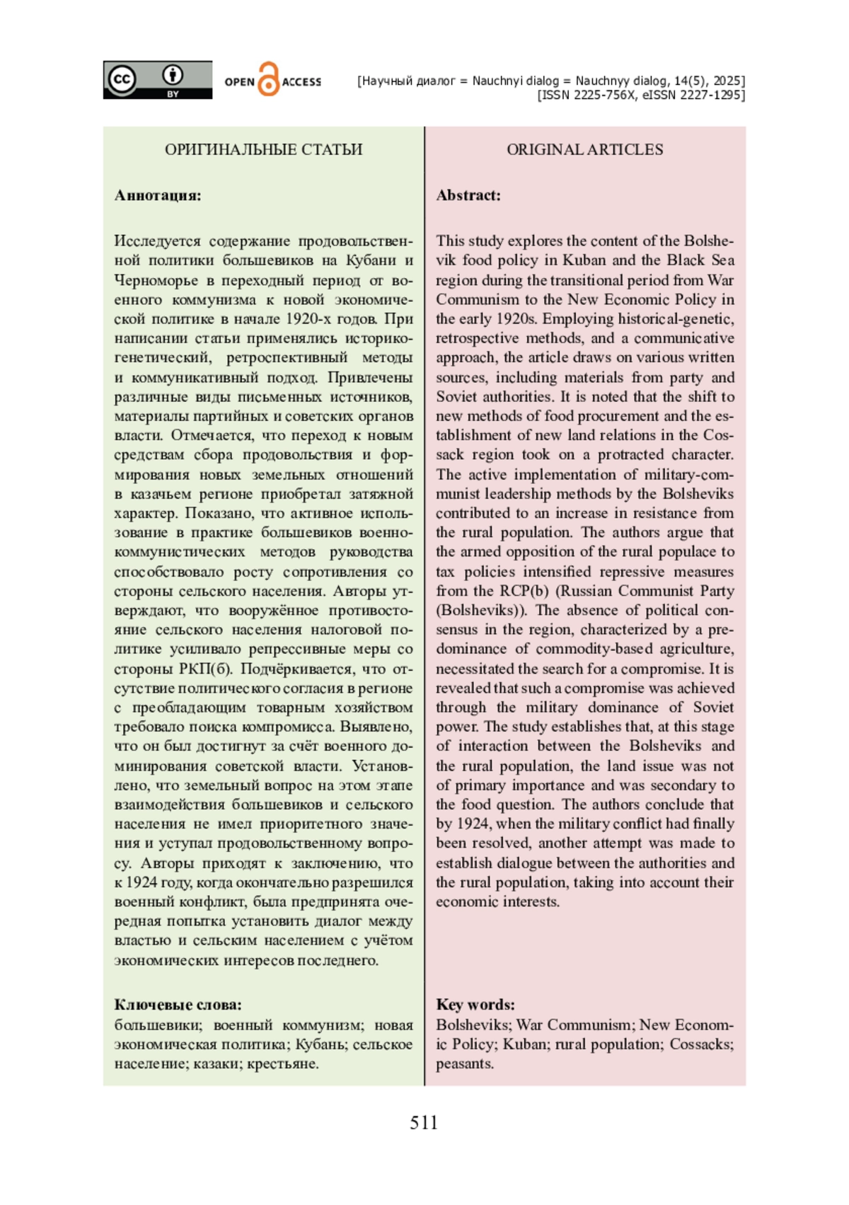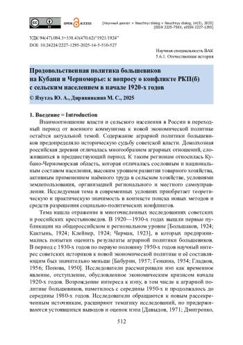 Исследуется содержание продовольственной политики большевиков на Кубани и Черноморье в переходный период от военного коммунизма к новой экономической политике в начале 1920-х годов. При написании статьи применялись историко-генетический, ретроспективный методы и коммуникативный подход. Привлечены различные виды письменных источников, материалы партийных и советских органов власти. Отмечается, что переход к новым средствам сбора продовольствия и формирования новых земельных отношений в казачьем регионе приобретал затяжной характер. Показано, что активное использование в практике большевиков военно-коммунистических методов руководства способствовало росту сопротивления со стороны сельского населения. Авторы утверждают, что вооружённое противостояние сельского населения налоговой политике усиливало репрессивные меры со стороны РКП(б). Подчёркивается, что отсутствие политического согласия в регионе с преобладающим товарным хозяйством требовало поиска компромисса. Выявлено, что он был достигнут за счёт военного доминирования советской власти. Установлено, что земельный вопрос на этом этапе взаимодействия большевиков и сельского населения не имел приоритетного значения и уступал продовольственному вопросу. Авторы приходят к заключению, что к 1924 году, когда окончательно разрешился военный конфликт, была предпринята очередная попытка установить диалог между властью и сельским населением с учётом экономических интересов последнего.