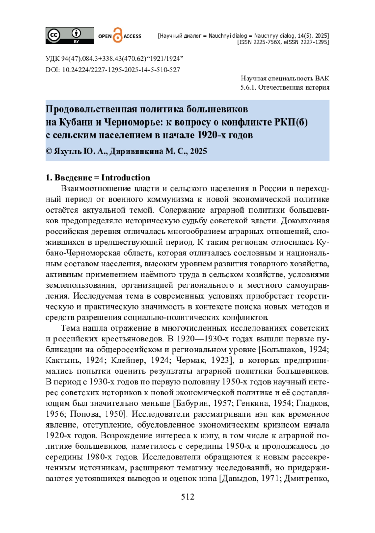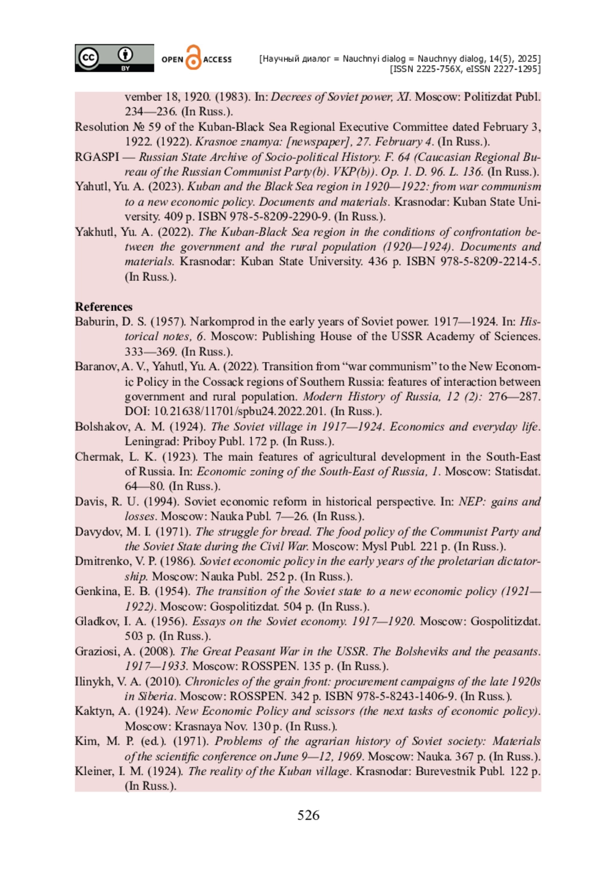 2. Баранов А. В. Переход от «военного коммунизма» к нэпу в казачьих областях Юга России: особенности взаимодействия власти и сельского населения / А. В. Бара нов, Ю. А. Яхутль // Новейшая история России. - 2022. - Т. 12. - № 2. - С. 276- 287. - https://doi.org/10.21638/11701/spbu24.2022.201.