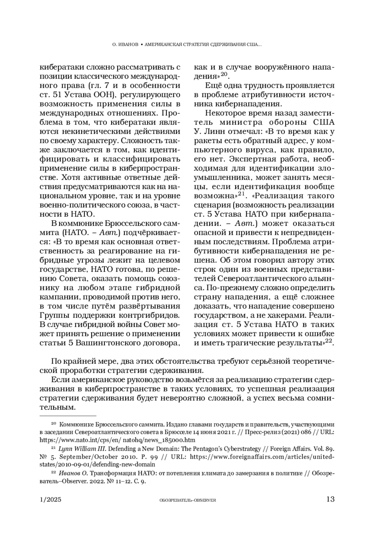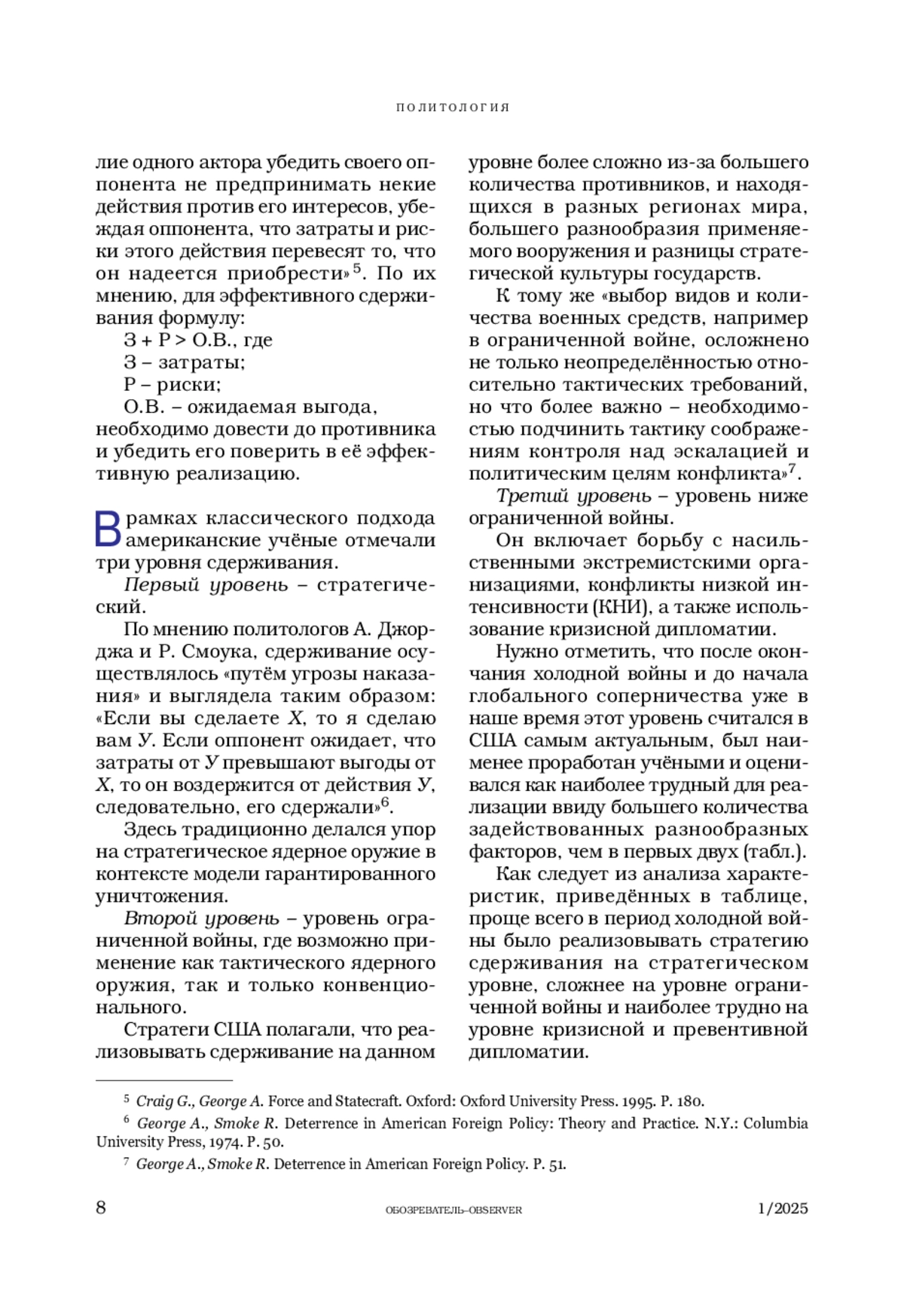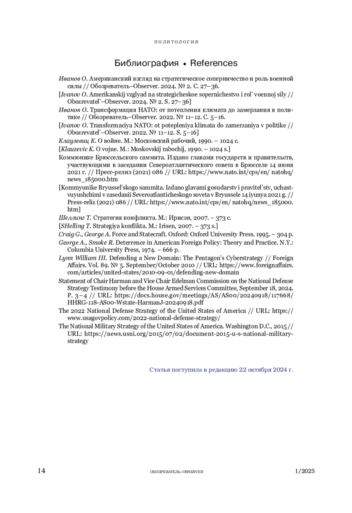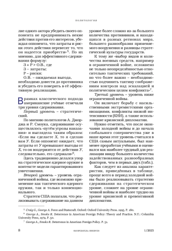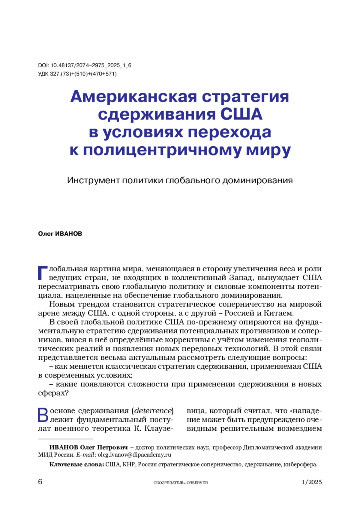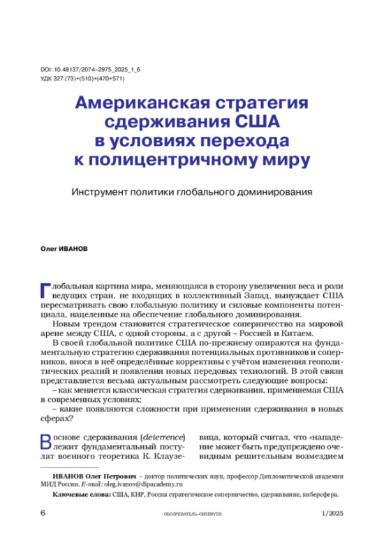 ИВАНОВ О. П. АМЕРИКАНСКАЯ СТРАТЕГИЯ СДЕРЖИВАНИЯ США В УСЛОВИЯХ ПЕРЕХОДА К ПОЛИЦЕНТРИЧНОМУ МИРУ. ИНСТРУМЕНТ ПОЛИТИКИ ГЛОБАЛЬНОГО ДОМИНИРОВАНИЯ // ОБОЗРЕВАТЕЛЬ. 2025. № 1