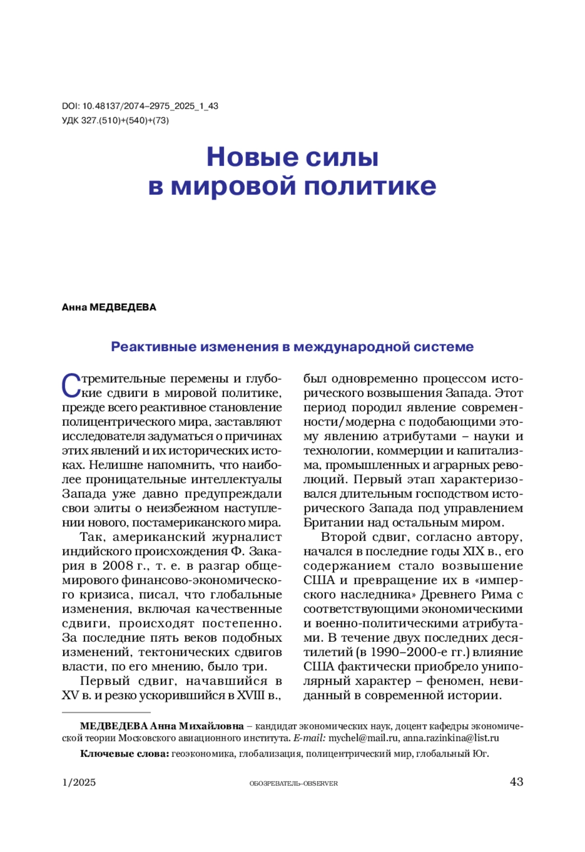 2. Володин А.Г. Возвращение развития: полицентрический мир в поисках новой экзистенциальной парадигмы // Вестник РАН. 2023. Т. 93. № 11. С. 1019-1031.