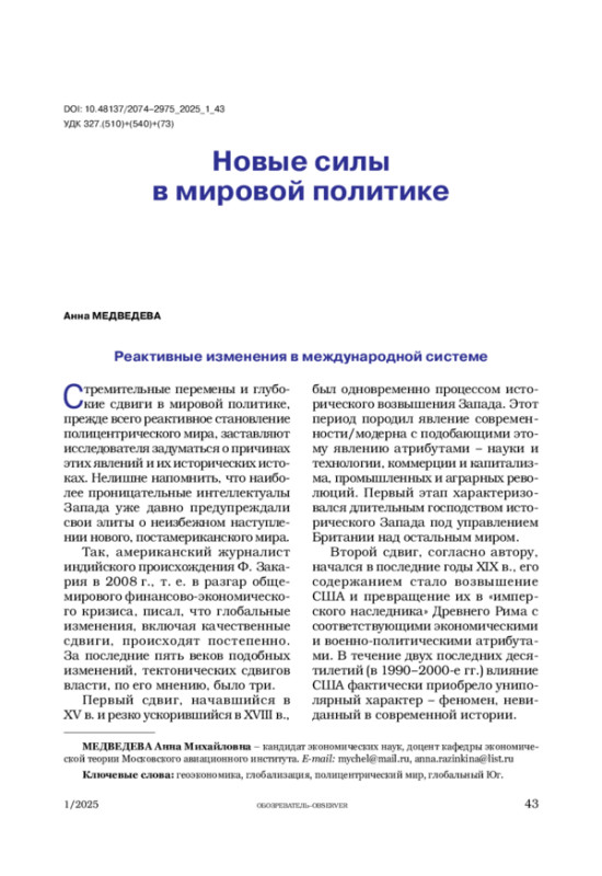 В статье рассматривается проблема появления новых сил/новых игроков в мировой экономике и политике. Автор обращает внимание на активизацию государств мирового большинства, которая прошла в своём развитии несколько этапов. Отмечается скоротечный характер монополярного мира. Становление полицентрического мироустройства рассматривается как развитие логики естественной эволюции мировой экономики и глобальной политики в первой четверти XXI в.
