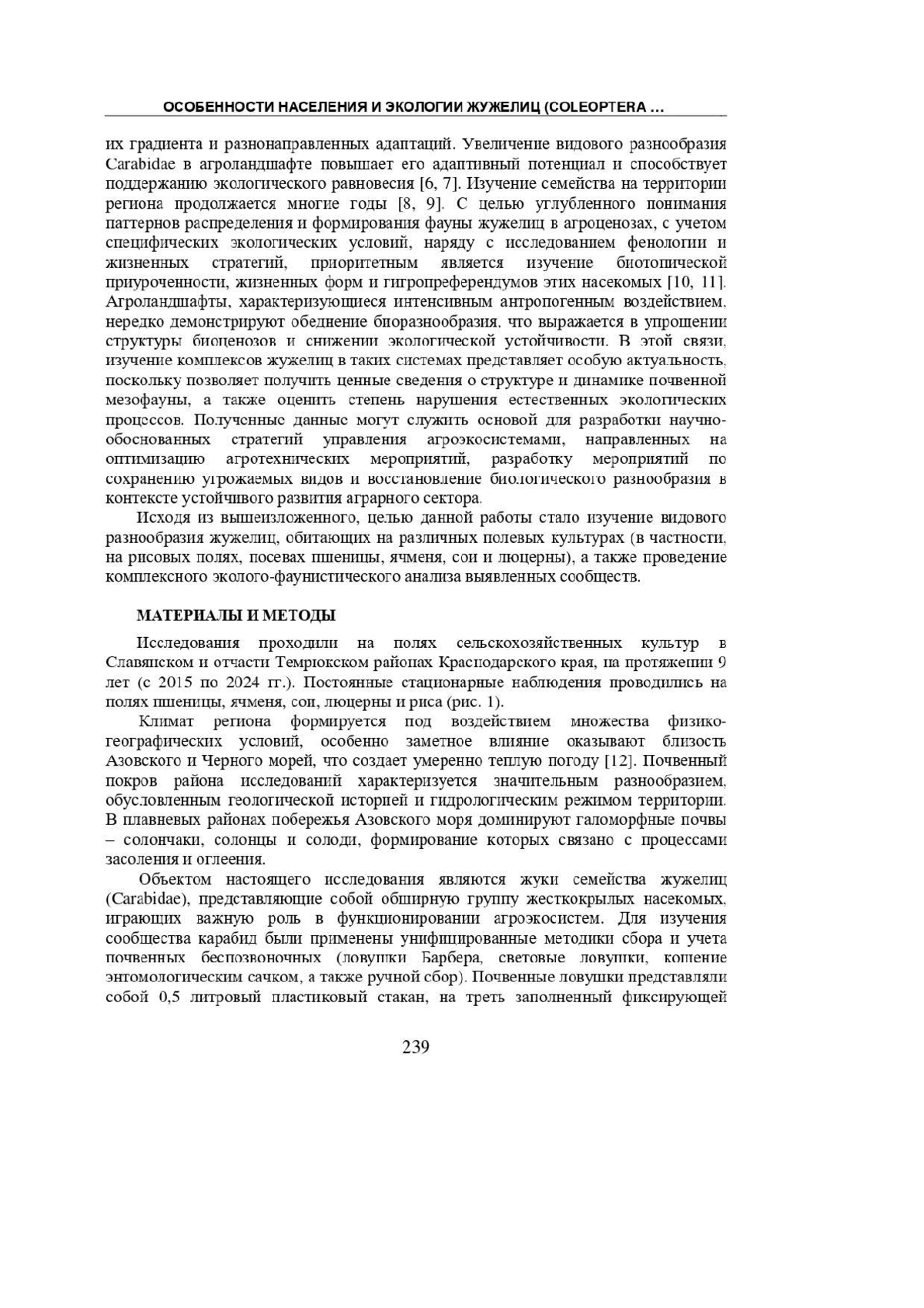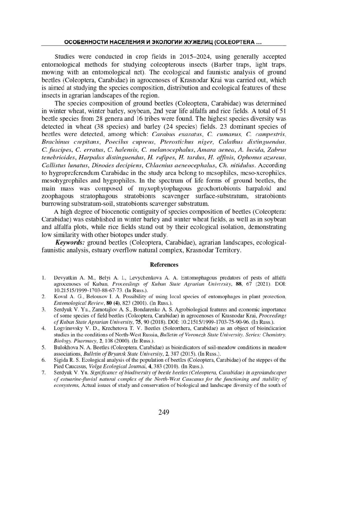 Проведен эколого-фаунистический анализ жуков-жужелиц (Coleoptera, Carabidae) в агроценозах Краснодарского края, направленный на изучение видового состава, распределения и экологических особенностей этих насекомых в условиях сельскохозяйственных ландшафтов региона. Установлен видовой состав карабид на полях озимой пшеницы, озимого ячменя, сои, люцерны 2-го года и рисовых полях. Всего обнаружен 51 вид жуков из 28 родов и 16 триб. Наибольшее видовое разнообразие отмечено на полях пшеницы (38 видов) и ячменя (24 вида). Выявлено 23 доминирующих вида жужелиц, среди которых: Carabus exaratus, C. cumanus, C. campestris, Brachinus crepitans, Poecilus cupreus, Pterostichus niger, Calathus distinguendus, C. fuscipes, C. erratus, C. halensis, C. melanocephalus, Amara aenea, A. lucida, Zabrus tenebrioides, Harpalus distinguendus, H. rufipes, H. tardus, H. affinis, Ophonus azureus, Callistus lunatus, Dinodes decipiens, Chlaenius aeneocephalus, Ch. nitidulus. По гигропреферендуму Carabidae в исследуемом районе относятся к мезофилам, мезо-ксерофилам, мезогигрофилам и гигрофилам. В спектре жизненных форм жужелиц основную массу составляли миксофитофаги геохортобионты гарпалоидные и зоофаги стратобионты-скважники поверхностно-подстилочные, стратобионты зарывающиеся подстилочно-почвенные, стратобионты-скважники подстилочные. Установлена степень сходства видового состава жужелиц, между полями сельскохозяйственных культур.