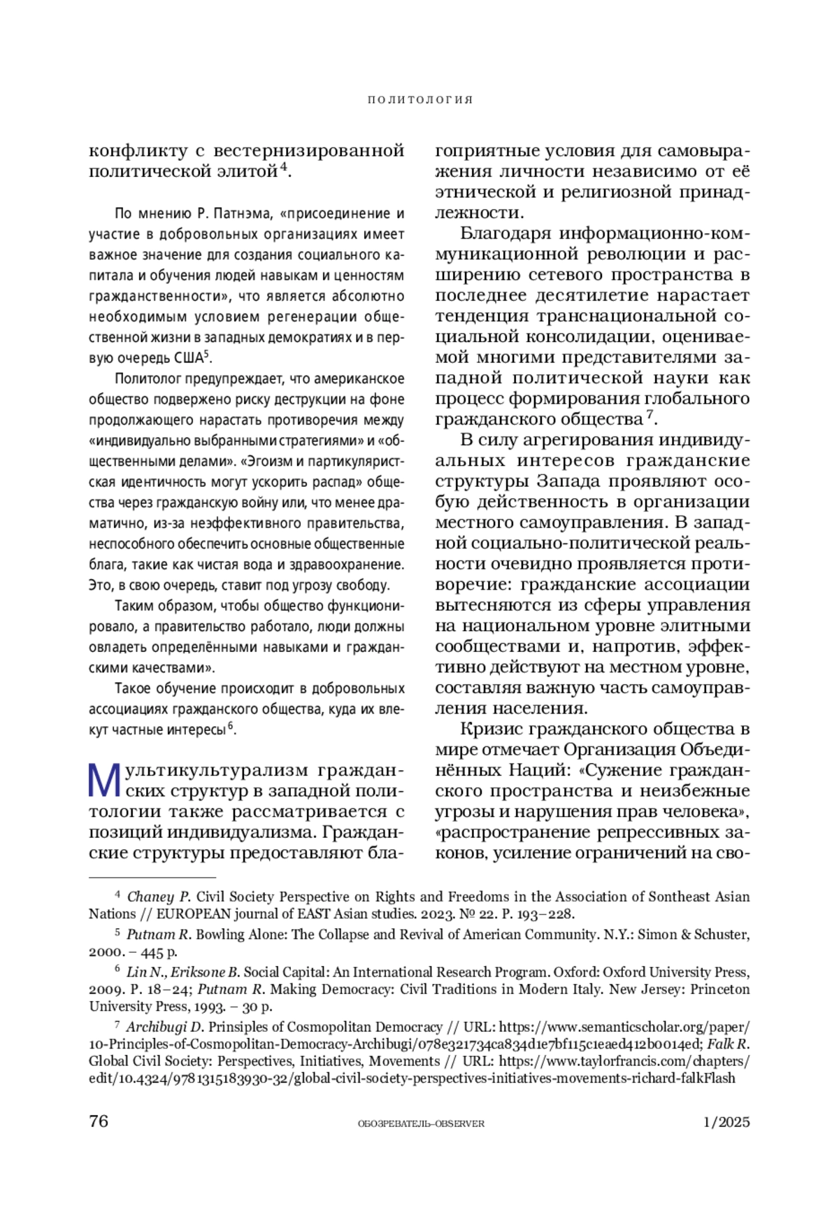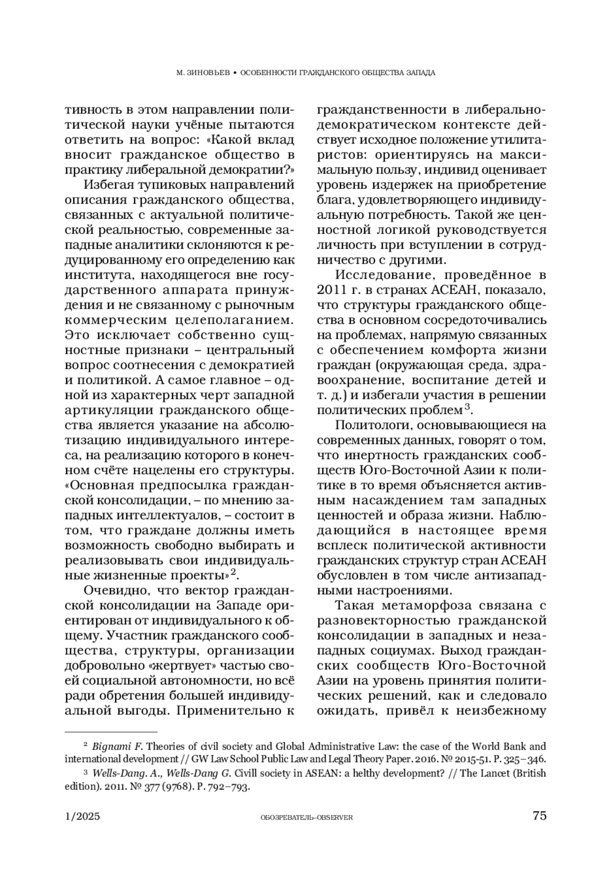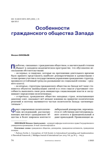 ЗИНОВЬЕВ М. А. ОСОБЕННОСТИ ГРАЖДАНСКОГО ОБЩЕСТВА НА ЗАПАДЕ // ОБОЗРЕВАТЕЛЬ. 2025. № 1