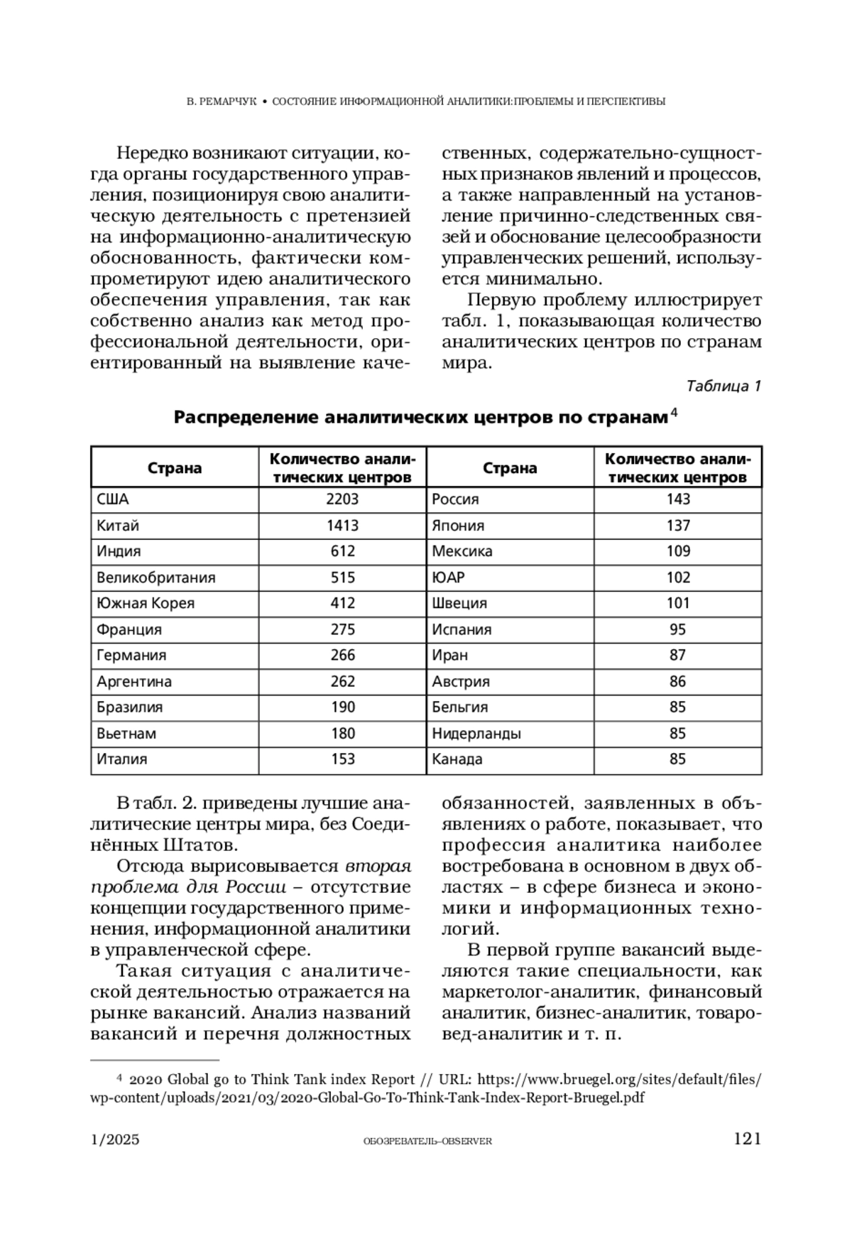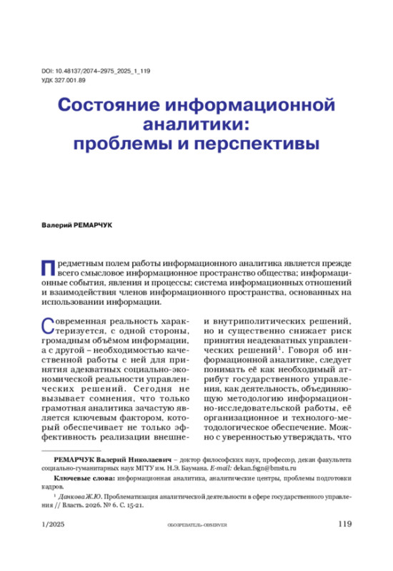 Информационная аналитика является важной составляющей трансформации научного познания, которая как дисциплина и способ освоения политической практики находится в состоянии активного развития. Подготовка кадров является одной из важнейших проблем.