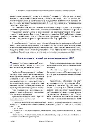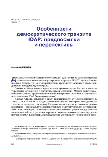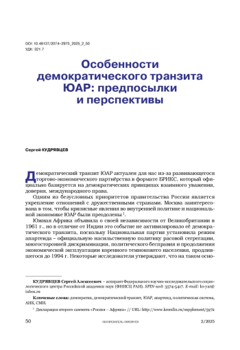 В статье обобщены основные характеристики модели демократического транзита ЮАР на основе вторичного анализа научных статей, отчётов социально-политических исследовательских центров, а также результатов эмпирического исследования. Автор предпринял попытку ответить на вопросы: что обусловило демократический транзит ЮАР; что означает демократия для южноафриканцев; почему пробуксовывает модернизационный процесс в настоящее время и каковы его перспективы?