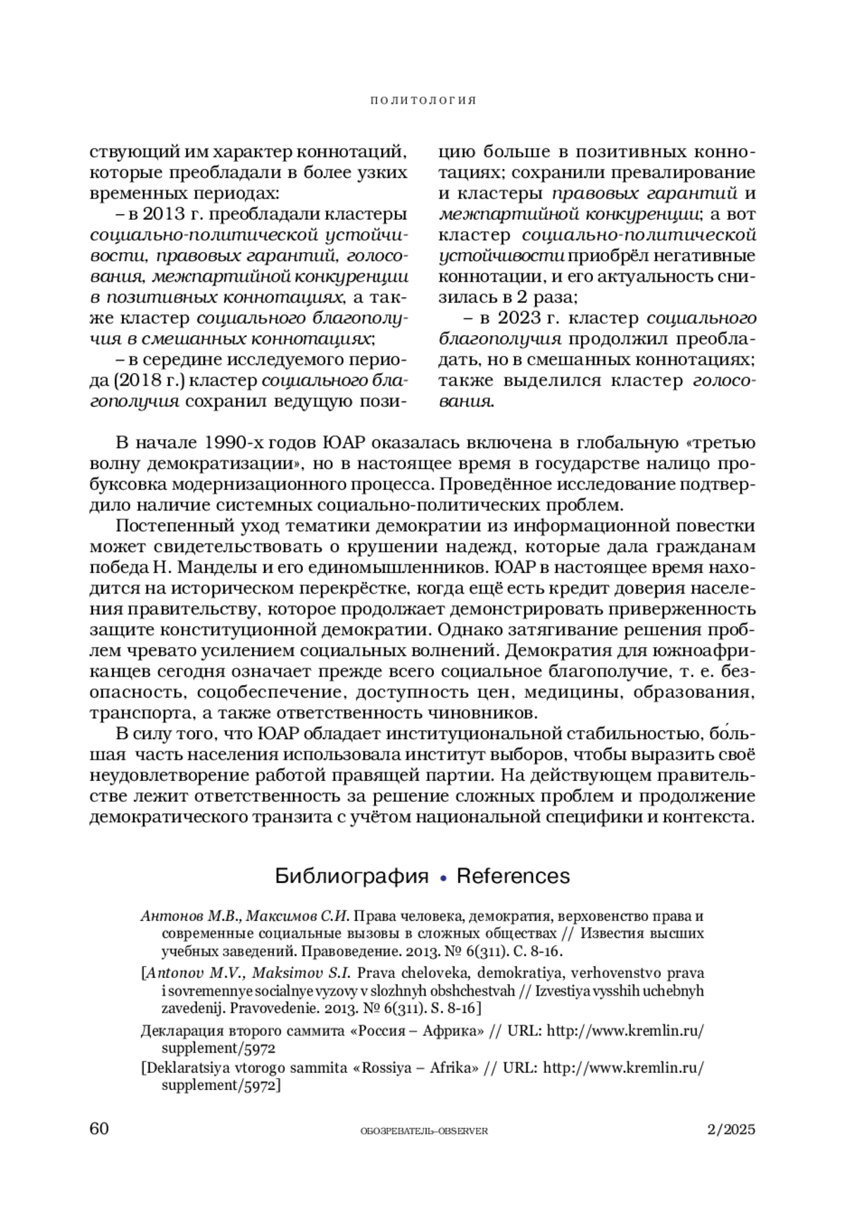 8. Скубко Ю.С., Сидоров В.А. ЮАР через четверть века после ликвидации апартеида // Азия и Африка сегодня. 2019. № 11. С. 61-63.