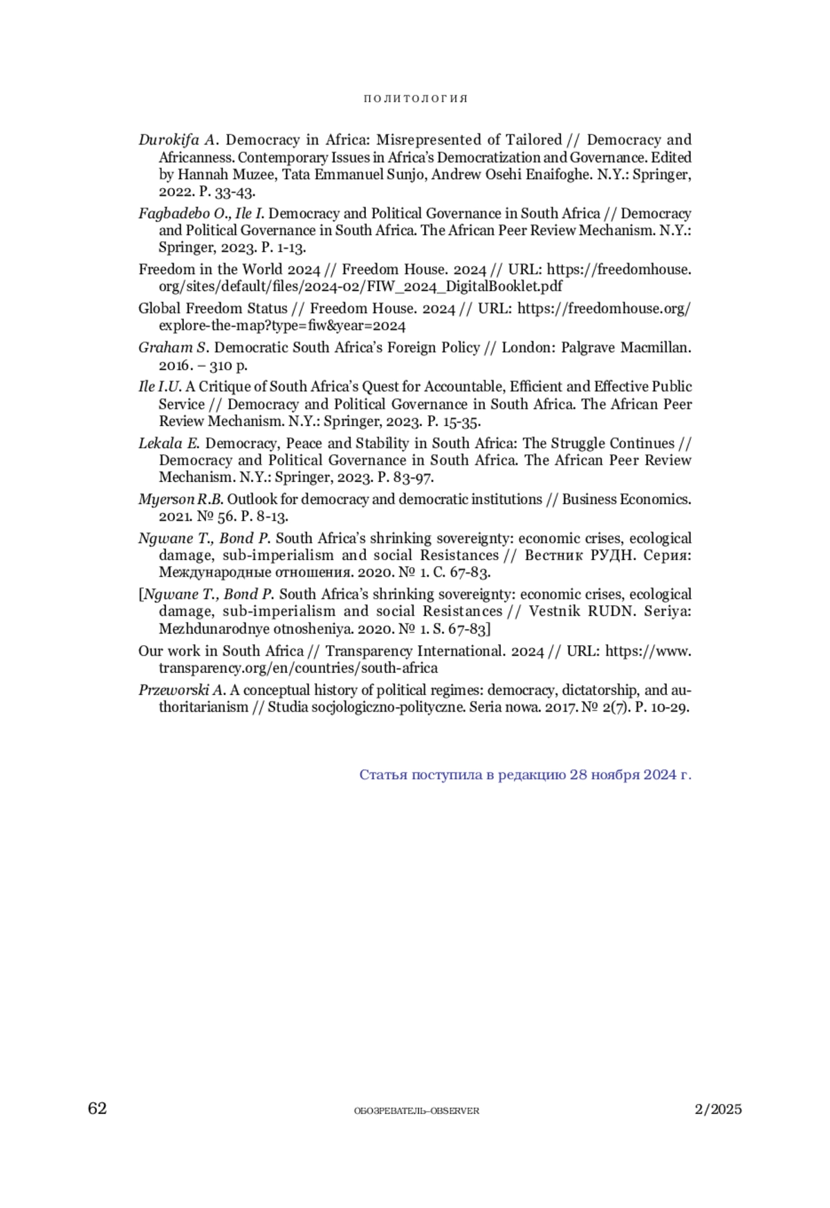 19. Lekala E. Democracy, Peace and Stability in South Africa: The Struggle Continues // Democracy and Political Governance in South Africa. The African Peer Review Mechanism. N.Y.: Springer, 2023. P. 83-97.