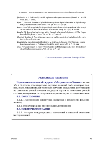 15. Цветкова Н.А., Сытник А.Н., Гришанина Т.А. Цифровая дипломатия и digital international relations: вызовы и новые возможности // Вестник Санкт-Петербургского университета. Международные отношения. 2022. Т. 15. Вып. 2. С. 174-196.