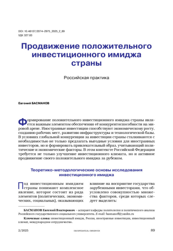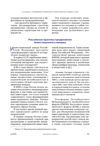 Автор рассматривает теоретические основы формирования инвестиционного имиджа страны на основе анализа российской практики, показывает ключевые аспекты и инструменты продвижения России как привлекательного направления для иностранных инвестиций, включая роль государственной политики, международных форумов и стратегий цифрового продвижения; анализирует успешные примеры из других стран (Сингапура, ОАЭ, США и Китая). В статье даются рекомендации по улучшению инвестиционного имиджа России.