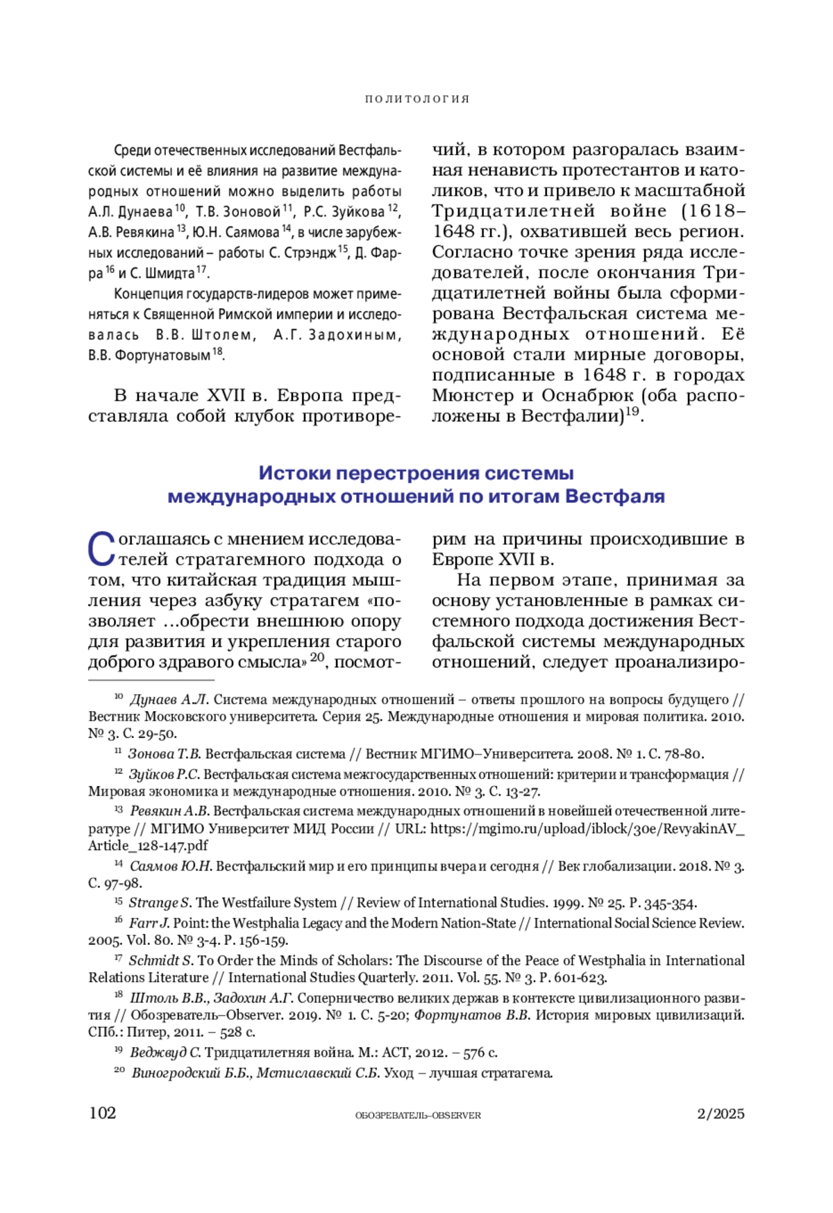 9. Зуйков Р.С. Вестфальская система межгосударственных отношений: критерии и трансформация // Мировая экономика и международные отношения. 2010. № 3. С. 13-27.