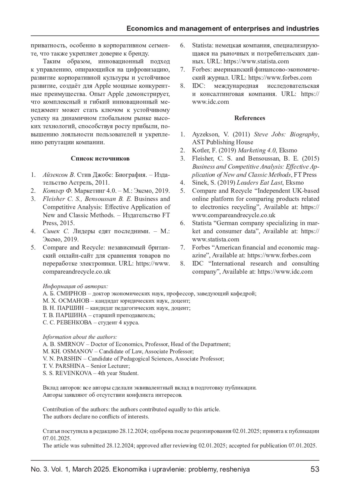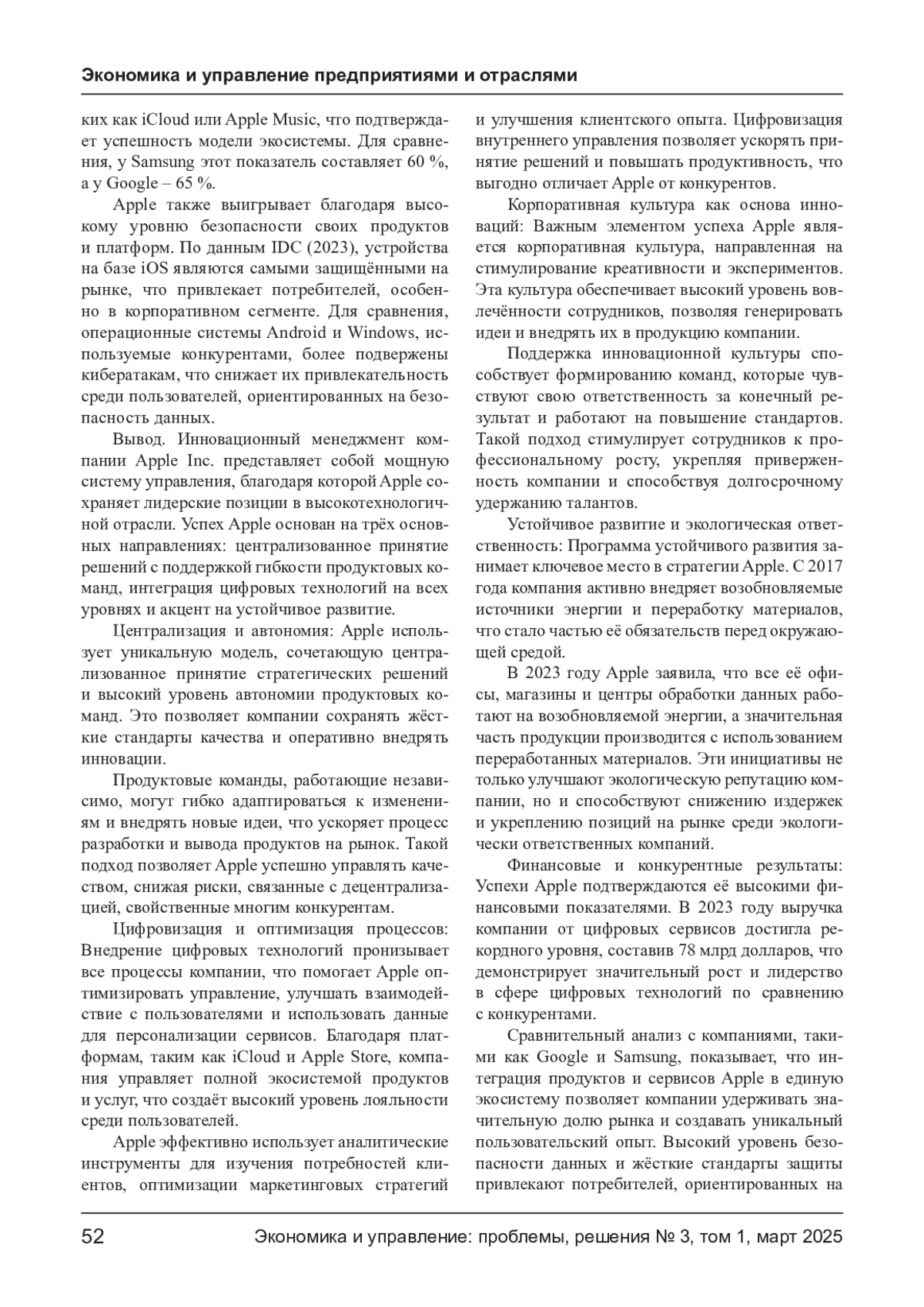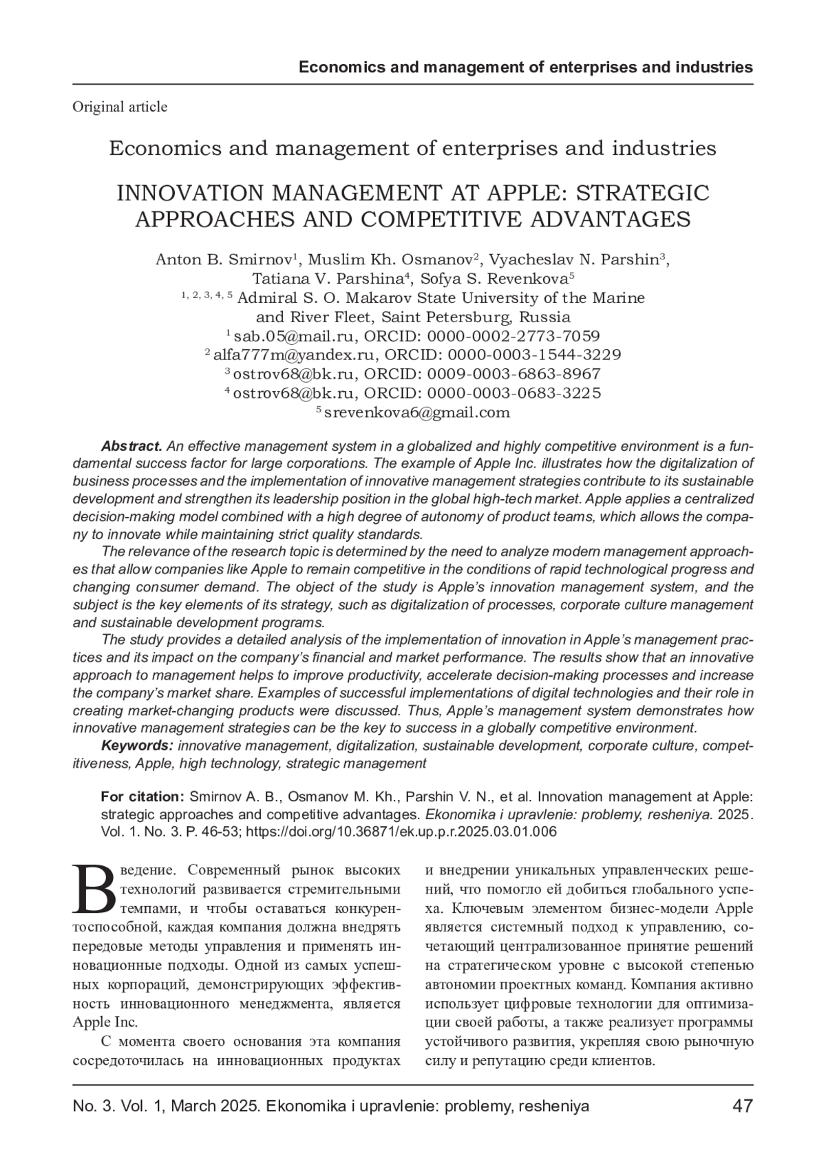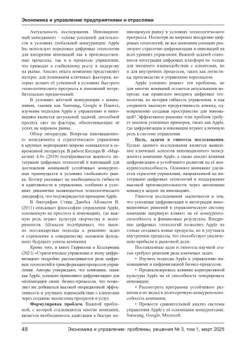 СМИРНОВ А. Б., ОСМАНОВ М. Х., ПАРШИН В. Н., ПАРШИНА Т. В., РЕВЕНКОВА С. С. ИННОВАЦИОННЫЙ МЕНЕДЖМЕНТ В КОМПАНИИ APPLE: СТРАТЕГИЧЕСКИЕ ПОДХОДЫ И КОНКУРЕНТНЫЕ ПРЕИМУЩЕСТВА // ЭКОНОМИКА И УПРАВЛЕНИЕ: ПРОБЛЕМЫ, РЕШЕНИЯ. 2025. ТОМ 1 № 3