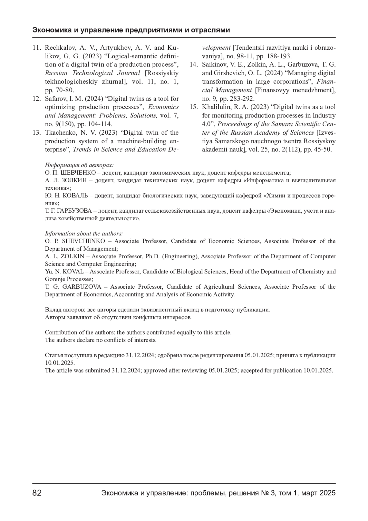 12. Сафаров И. М. Цифровые двойники как инструмент оптимизации производственных процессов // Экономика и управление: проблемы, решения. - 2024. - Т. 7, № 9(150). - С. 104-114. EDN: BGZSXC
