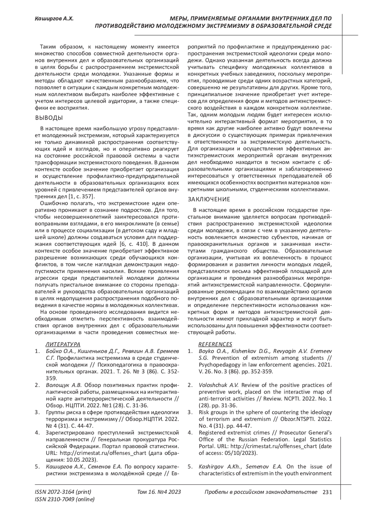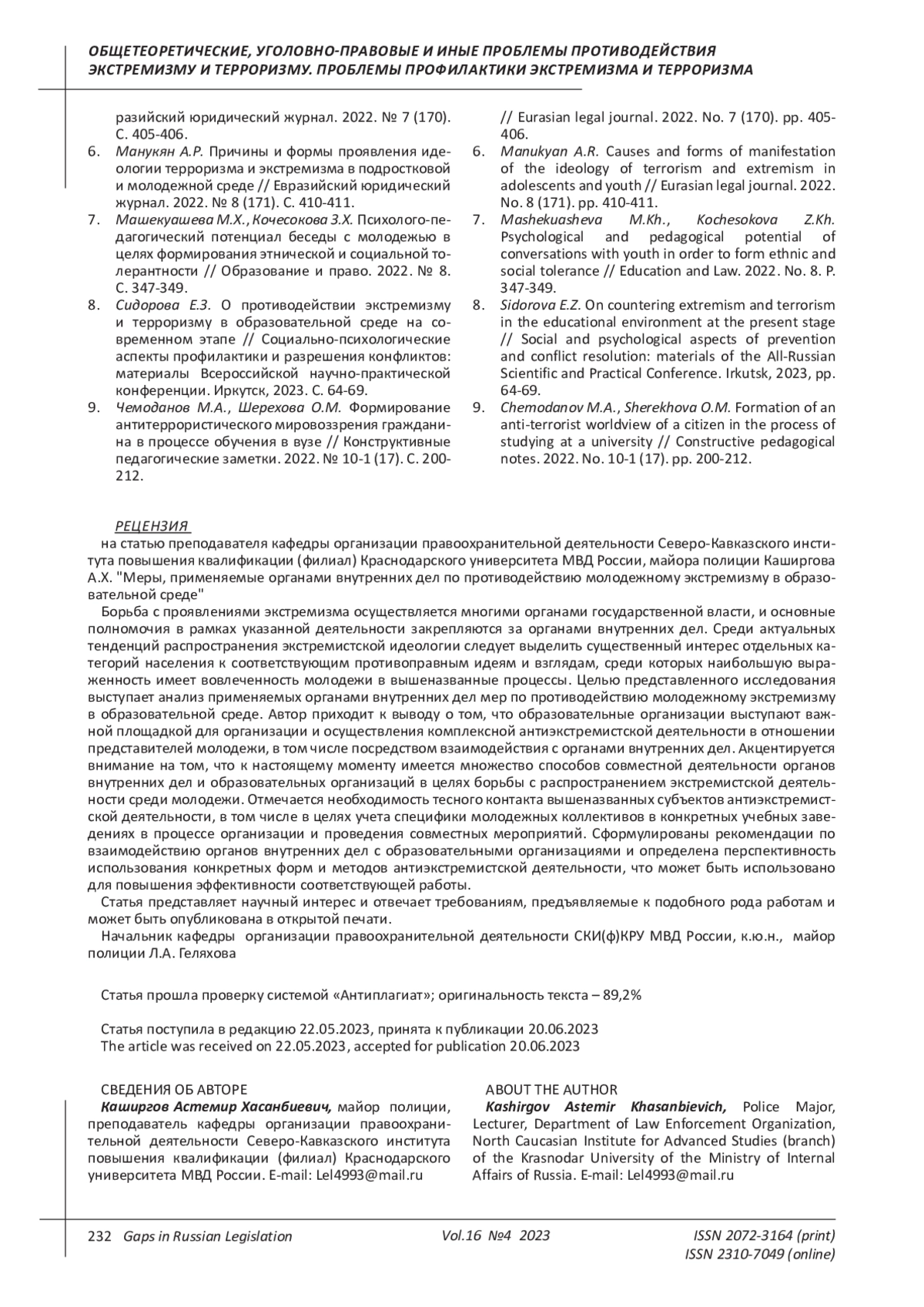 5. Каширгов А.Х., Семенов Е.А. По вопросу характеристики экстремизма в молодёжной среде // Евразийский юридический журнал. 2022. № 7 (170). С. 405-406. EDN: JROSXP