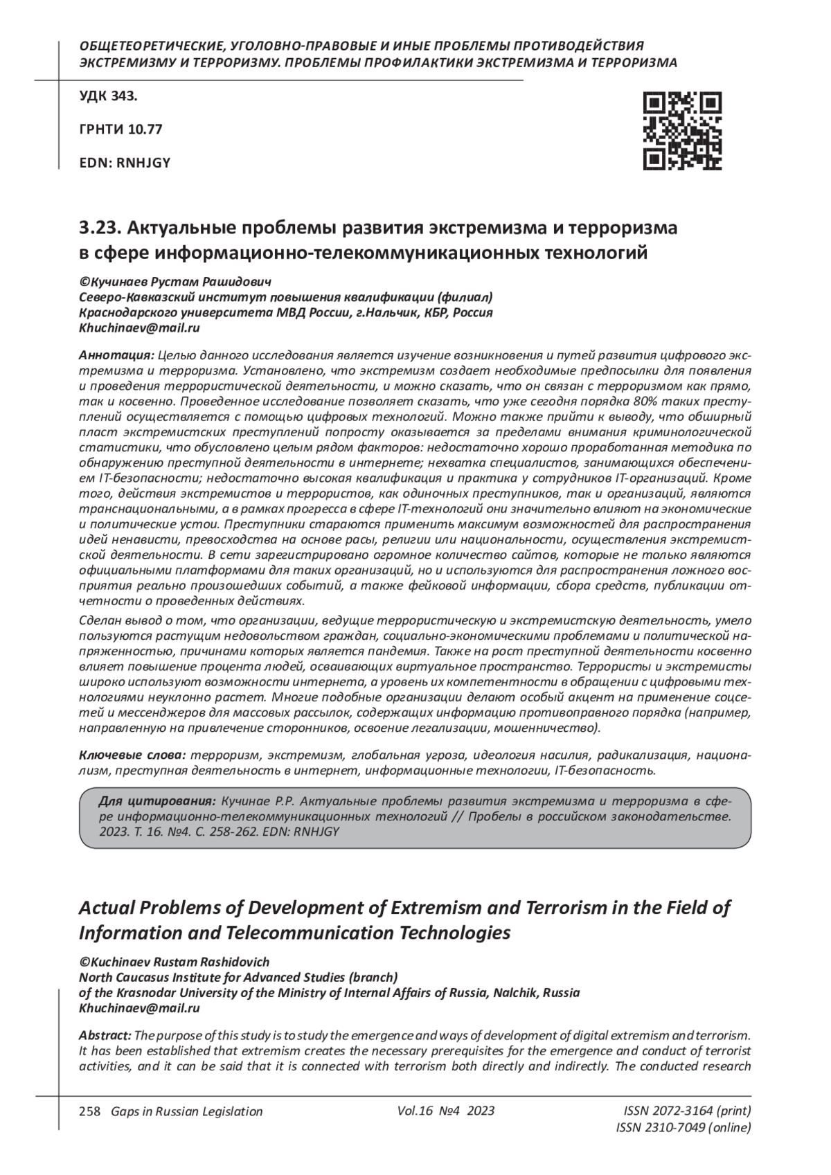 Takov A.Z. The spread of extremist ideology on the Internet: problems of detection and counteraction measures // Journal of Applied Research. 2022. No. 5-2. pp. 196-199.