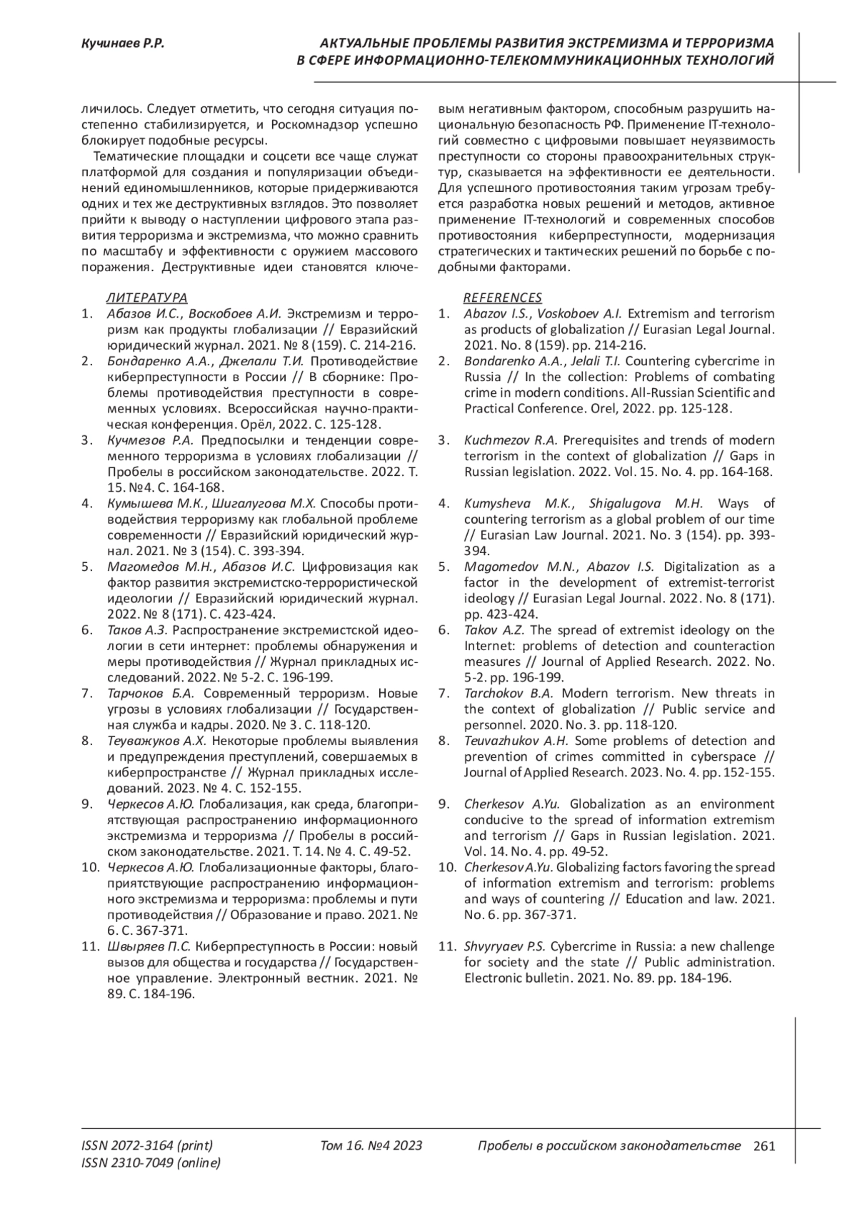 3. Кучмезов Р.А. Предпосылки и тенденции современного терроризма в условиях глобализации // Пробелы в российском законодательстве. 2022. Т. 15. №4. С. 164-168. EDN: TOOPPS
