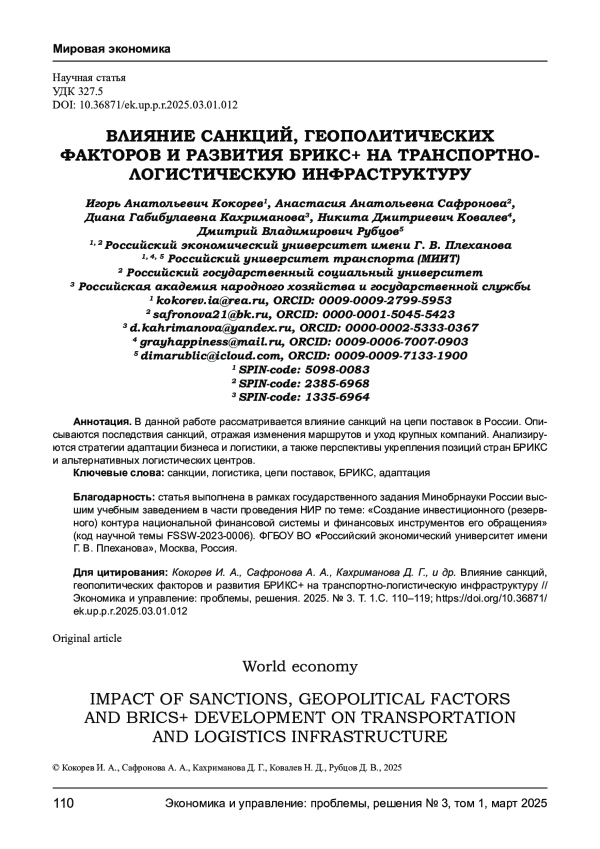 В данной работе рассматривается влияние санкций на цепи поставок в России. Описываются последствия санкций, отражая изменения маршрутов и уход крупных компаний. Анализируются стратегии адаптации бизнеса и логистики, а также перспективы укрепления позиций стран БРИКС и альтернативных логистических центров.