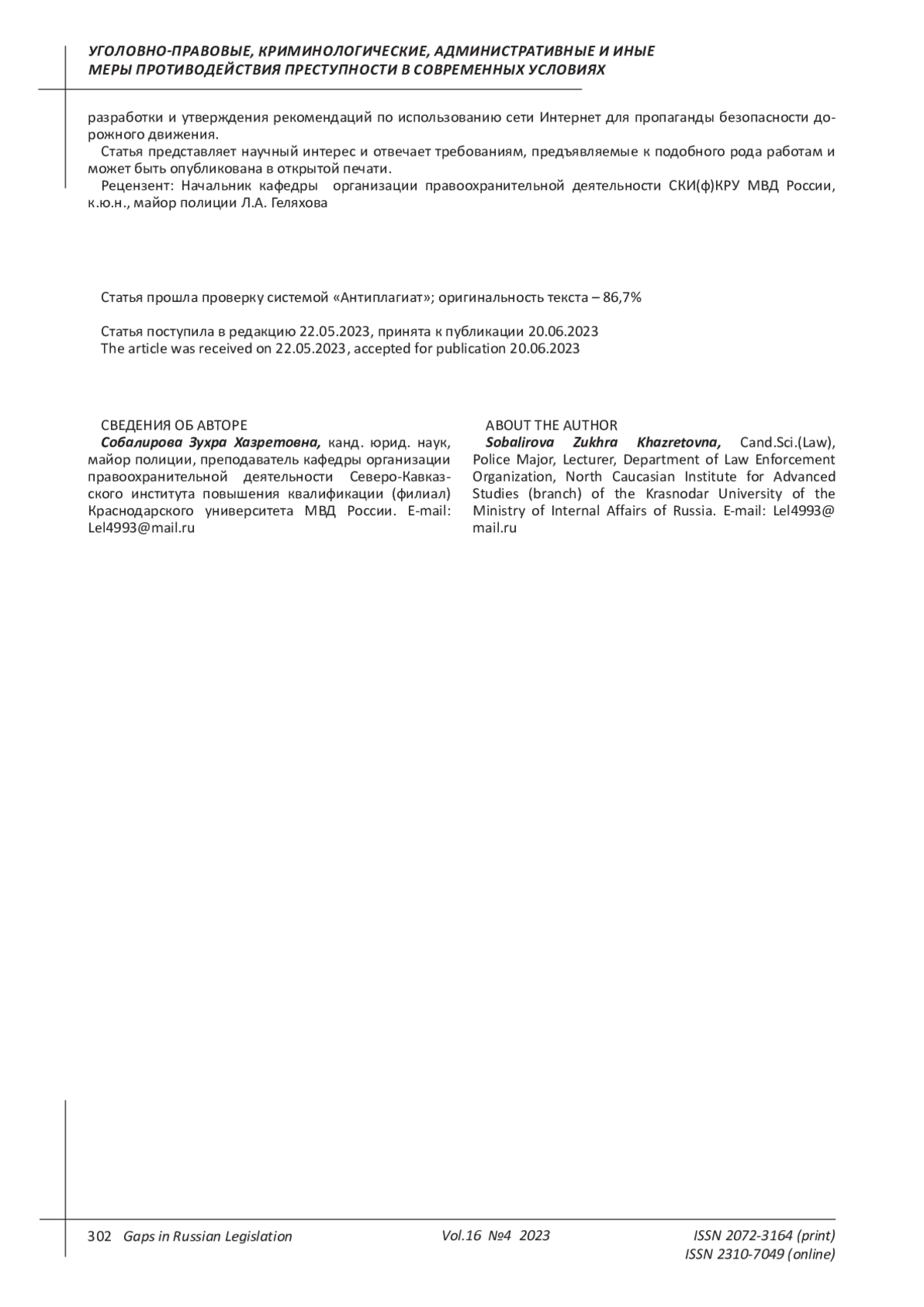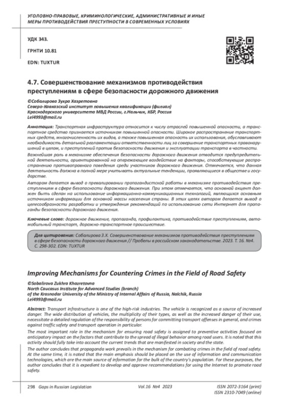 Kodzokova L. A. Problems of law enforcement of some administrative procedures by the traffic police of the Ministry of Internal Affairs of Russia // Gaps in Russian legislation. 2022. Vol. 15. No. 3. EDN: UMCAFM