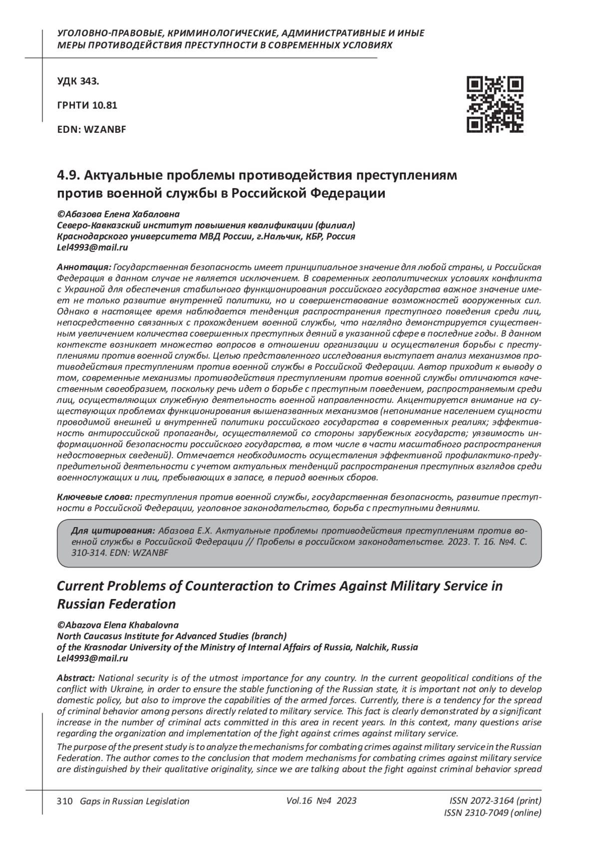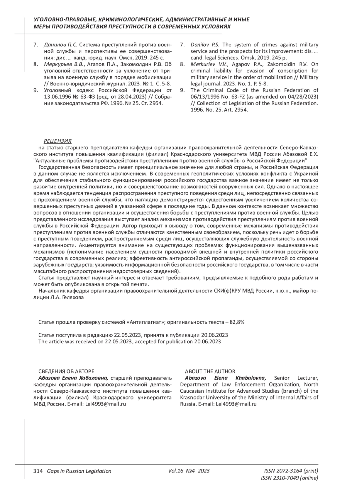 3. Решняк М.Г. К вопросу о совершенствовании уголовного законодательства об ответственности за преступления против военной службы // Современное право. 2023. № 2. С. 78-82. EDN: OLJOFH