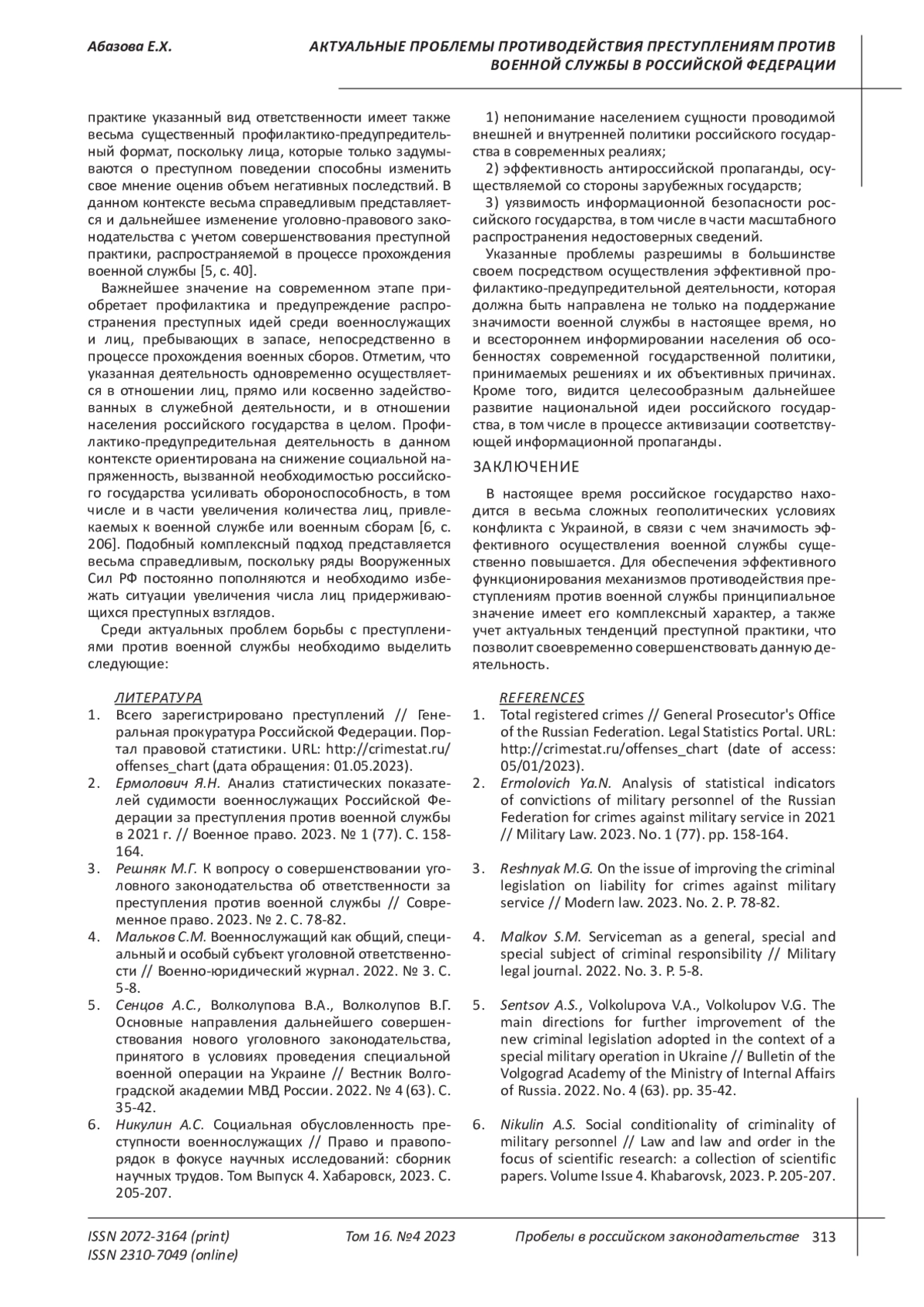 2. Ермолович Я.Н. Анализ статистических показателей судимости военнослужащих Российской Федерации за преступления против военной службы в 2021 г. // Военное право. 2023. № 1 (77). С. 158-164. EDN: FEQZAX